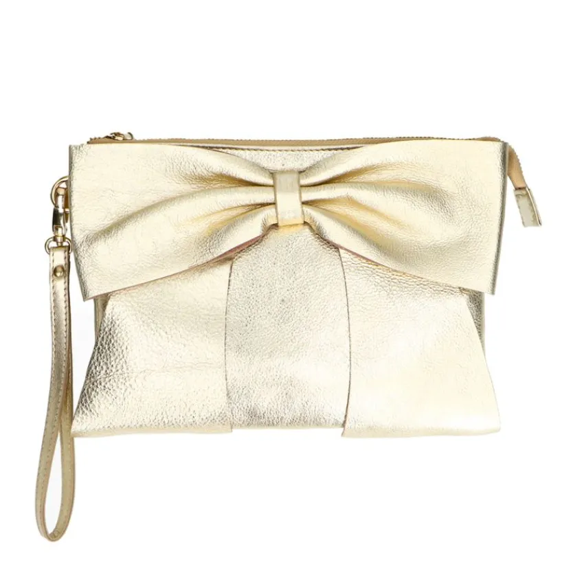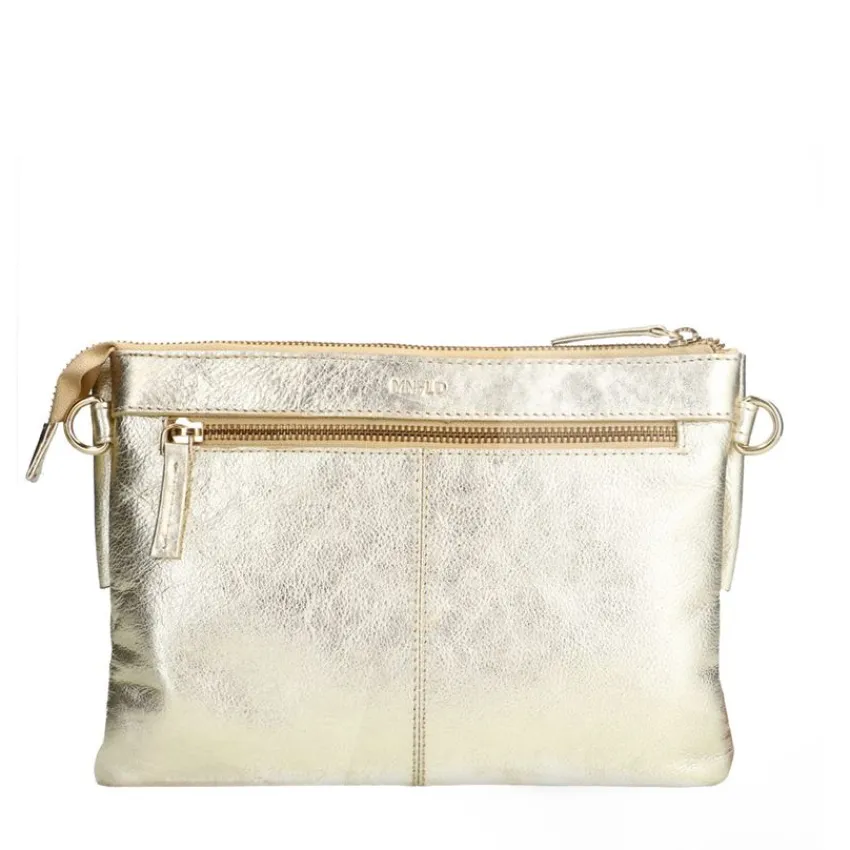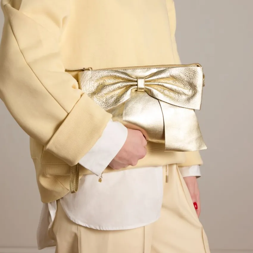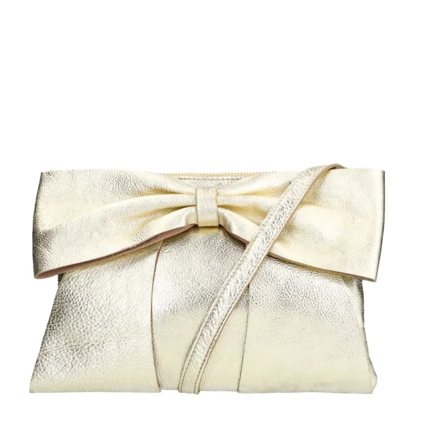 Gouden leren schoudertas met strik van Manfield. De afmeting van deze tas is 25x20x6 cm (BxHxD), voorzien van een verstelbare brede van van 130 cm. De tas kan gesloten worden door middel van een drukknoop en heeft een ritssluiting.