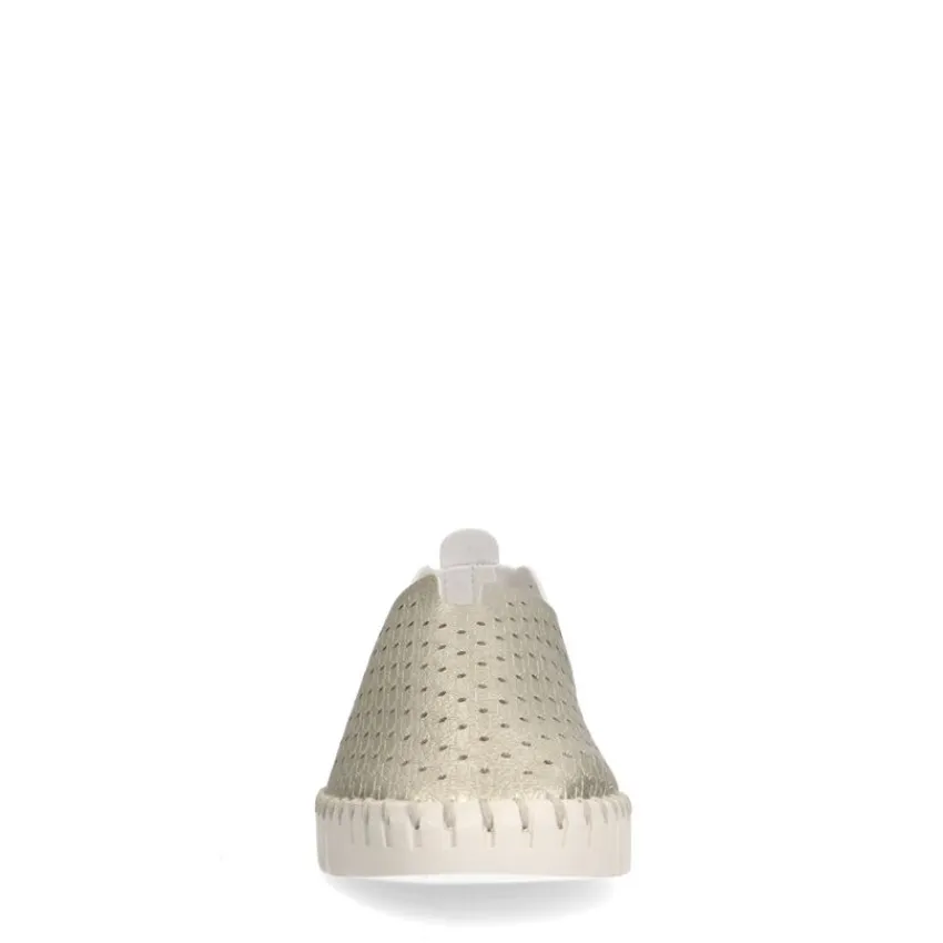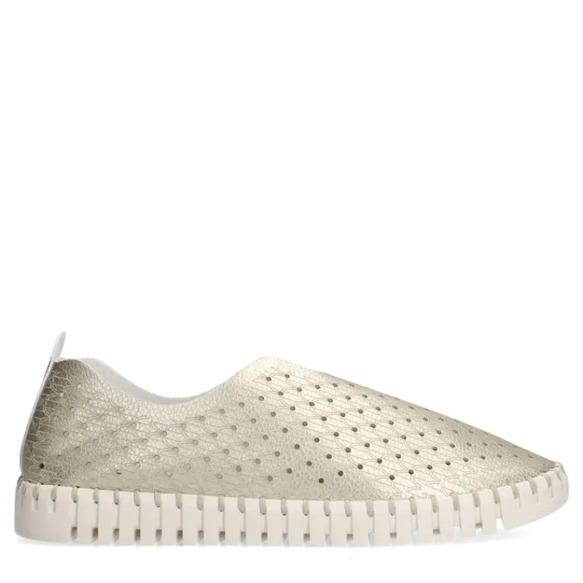 Gouden loafers Manfield en bestaan uit 50% polyurethaan en 50% nylon. Door het M patroon in deze sandalen komt Manfield hier in terug en bovendien hebben ze een uitneembaar voetbed.