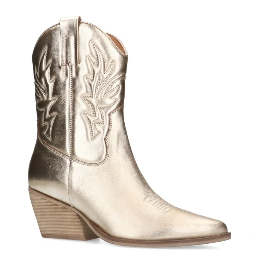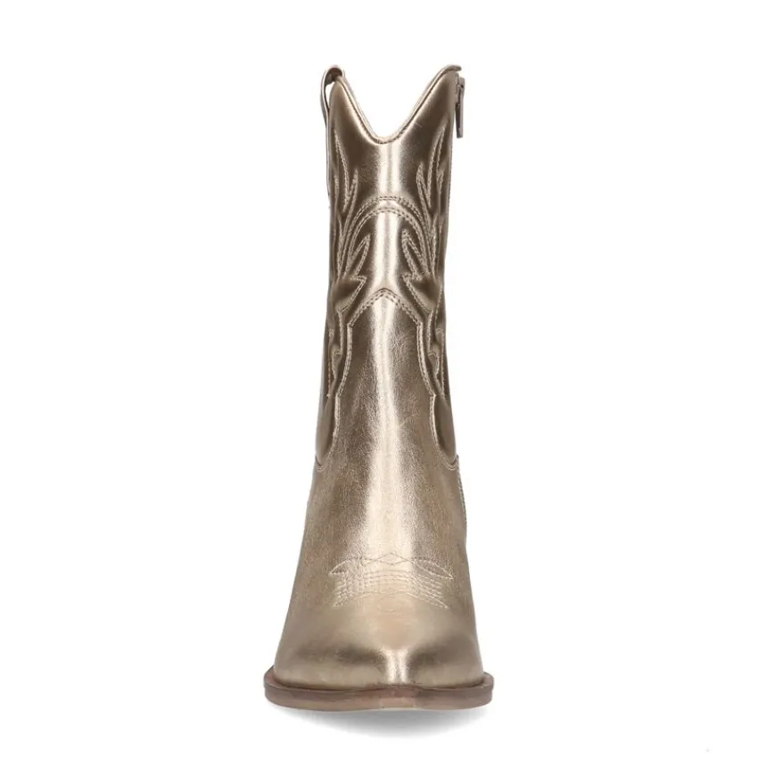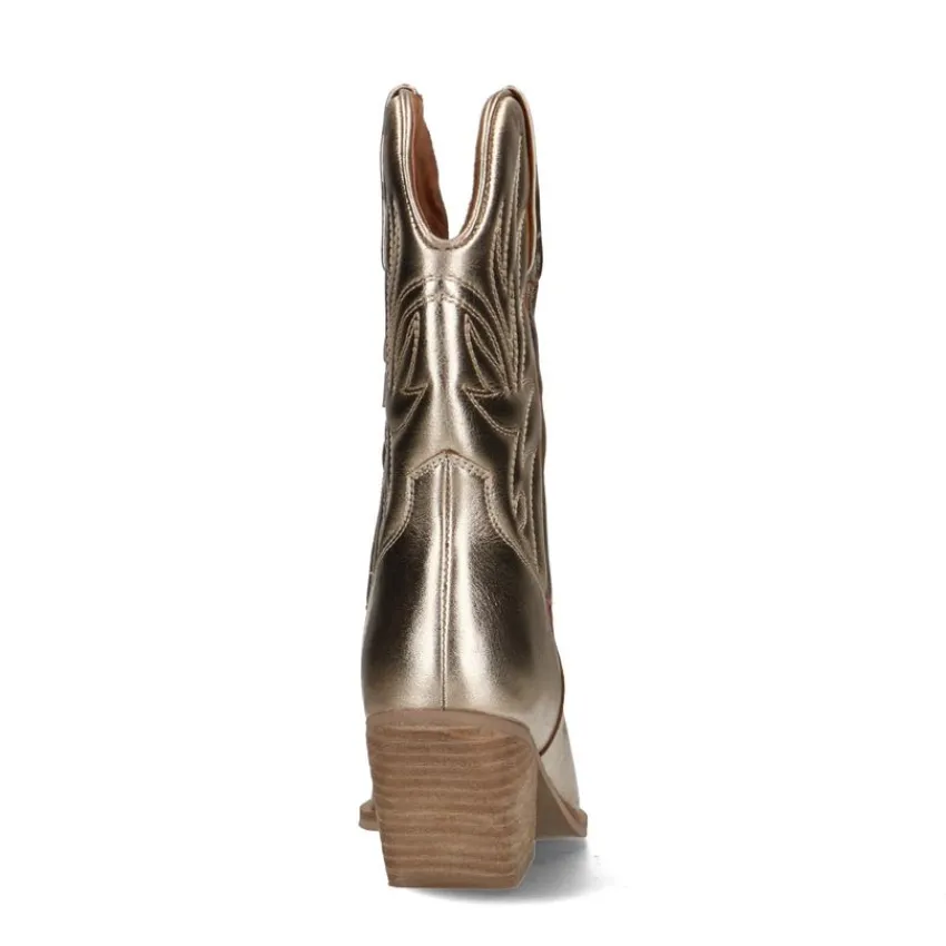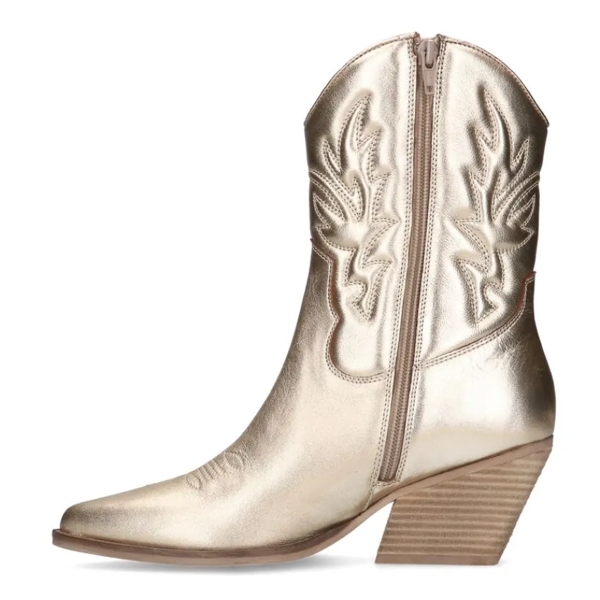Goudkleurige metallic cowboy laarzen van Manfield met blokhak van 7 cm en puntige neus. We adviseren als verzorging en bescherming de Collonil Carbon Pro.