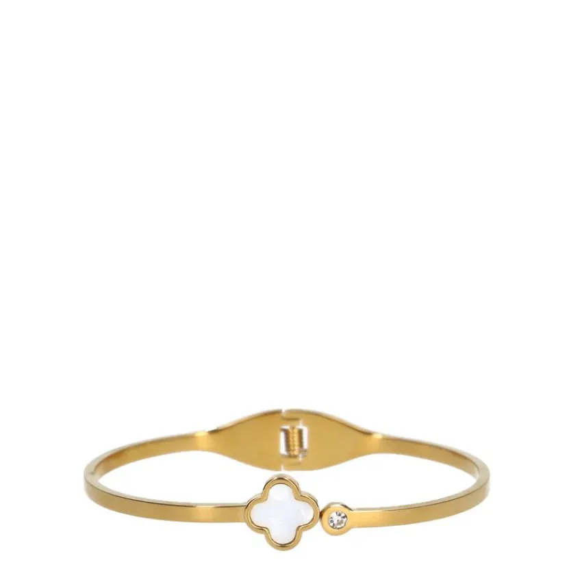 Goudkleurige bangle armband van Manfield met een klavertjes sluiting en steentje. De armband is gemaakt van stainless steel.