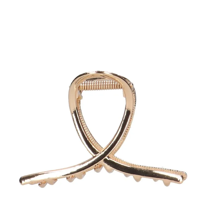 Goudkleurige haarklem van Manfield. Deze haarklem is voorzien van een gekruist design en heeft een hoogte van 5 cm. De klem heeft een lengte van 9 cm en de maximale breedte bedraagt 10 cm.