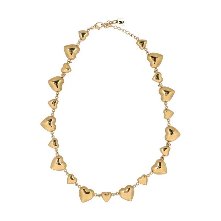 Goudkleurige hartjes ketting van Manfield met haakjes sluiting. De ketting heeft kleine en grote hartjes en een totale lengte van 45 cm.