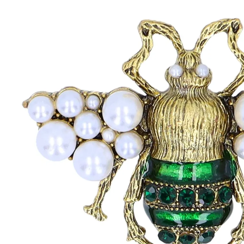 Goudkleurige kever broche van Manfield met groene en parel details. De broche heeft een breedte van 5 cm en een lengte v…