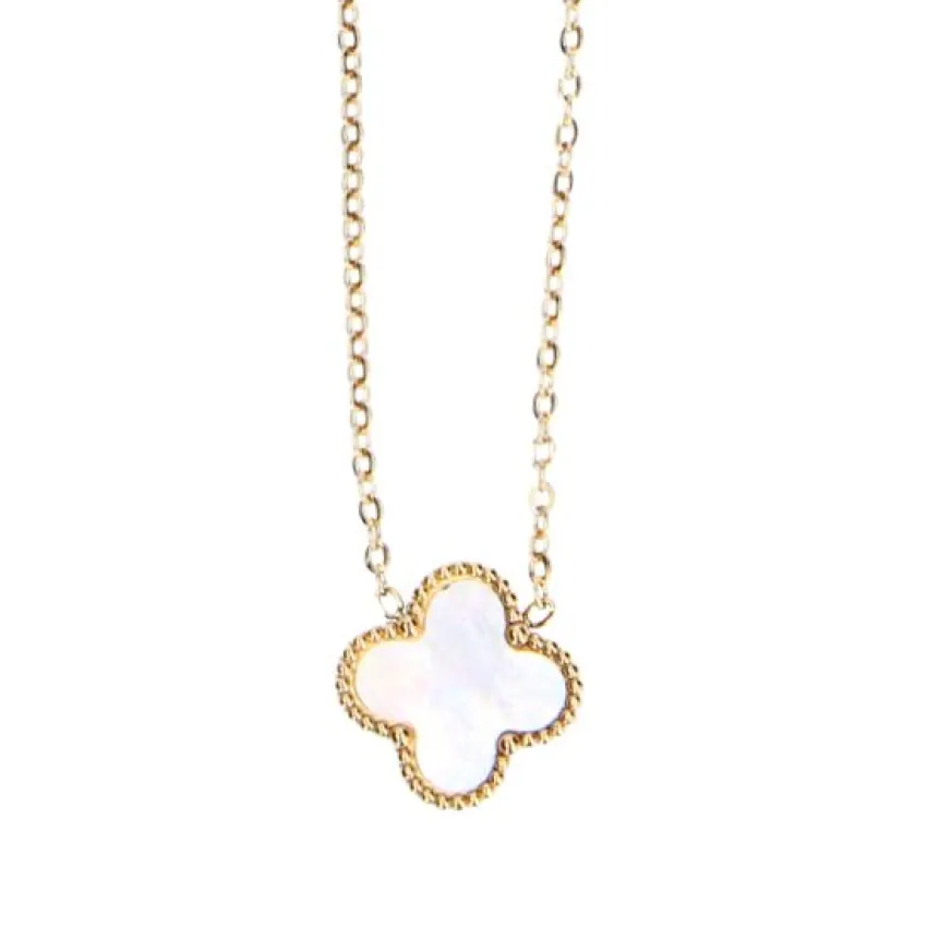 Goudkleurige klavertjes ketting met beige details van Manfield. De ketting heeft een totale lengte van 46 cm en is gemaakt van stainless steel. Wegens algemene hygiënevoorschriften kan dit artikel niet geretourneerd worden.