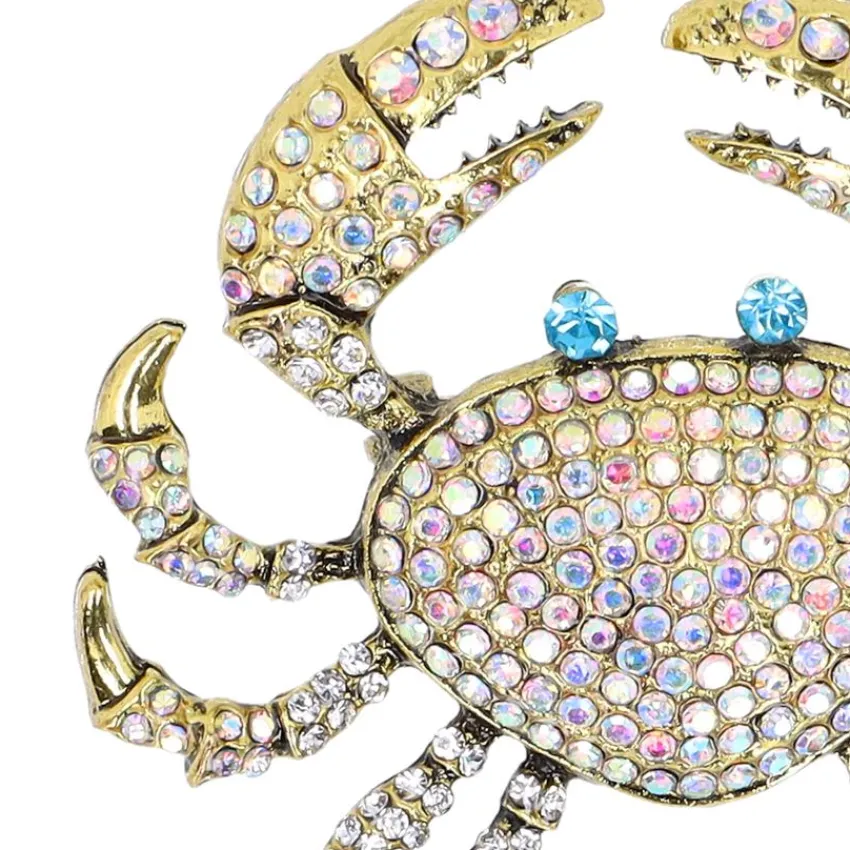 Goudkleurige krabben broche van Manfield met strass details. De broche is 7 cm breed en 6 cm lang.