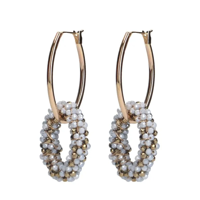Goudkleurige oorbellen met blauwe glaskralen hangers van Manfield. De oorbellen zijn 5 cm lang en mogen vanwege de hygiënevoorschriften niet geretourneerd worden.