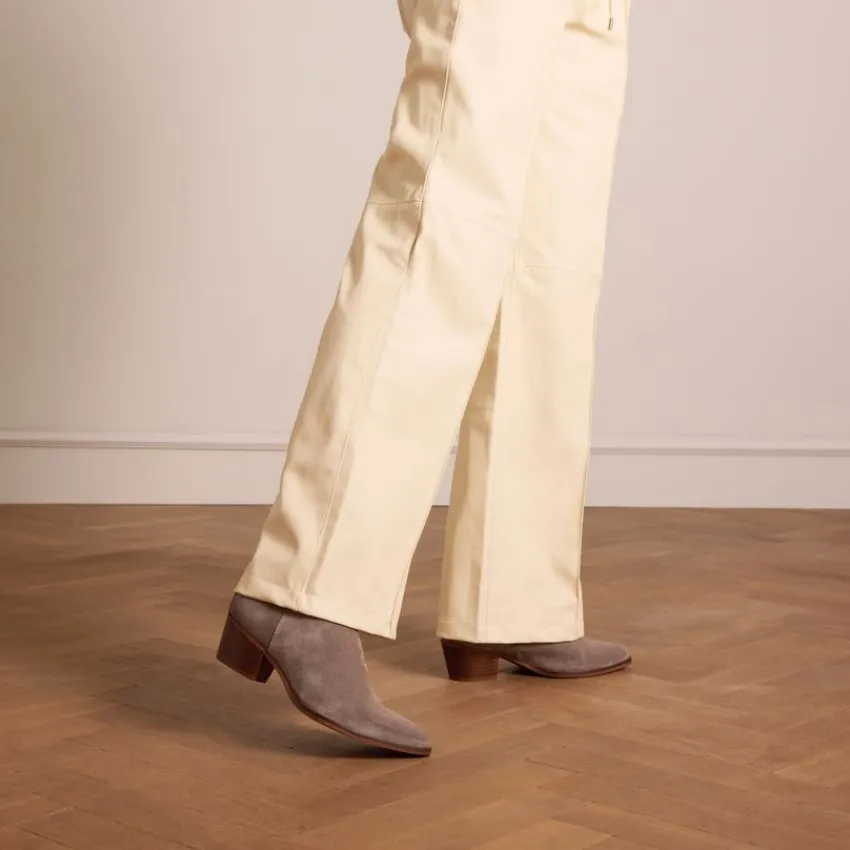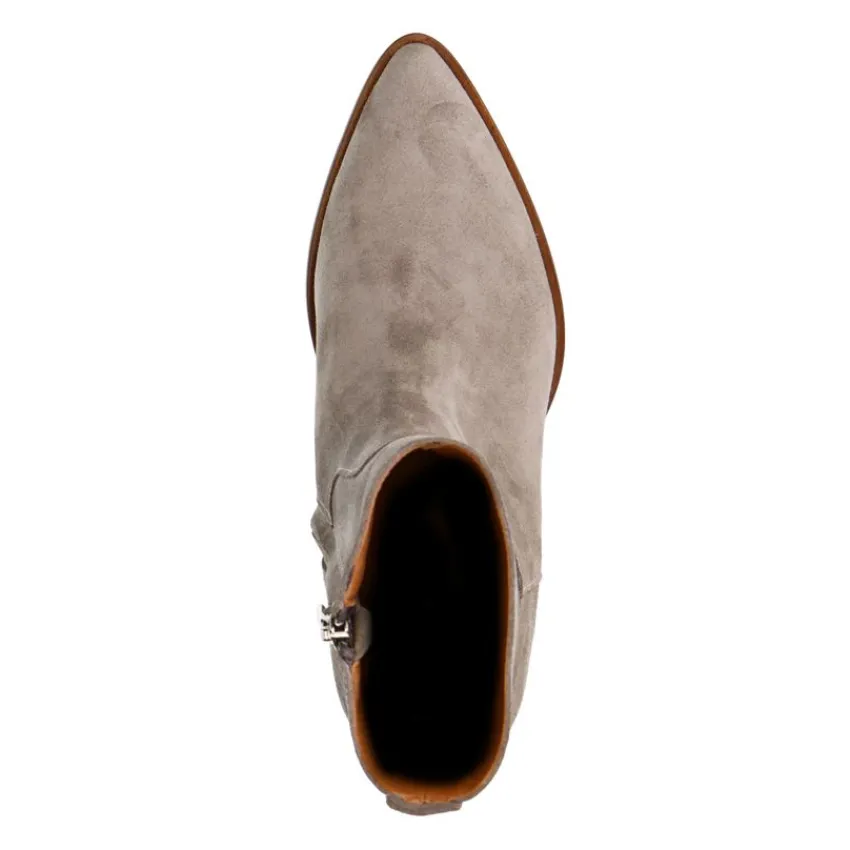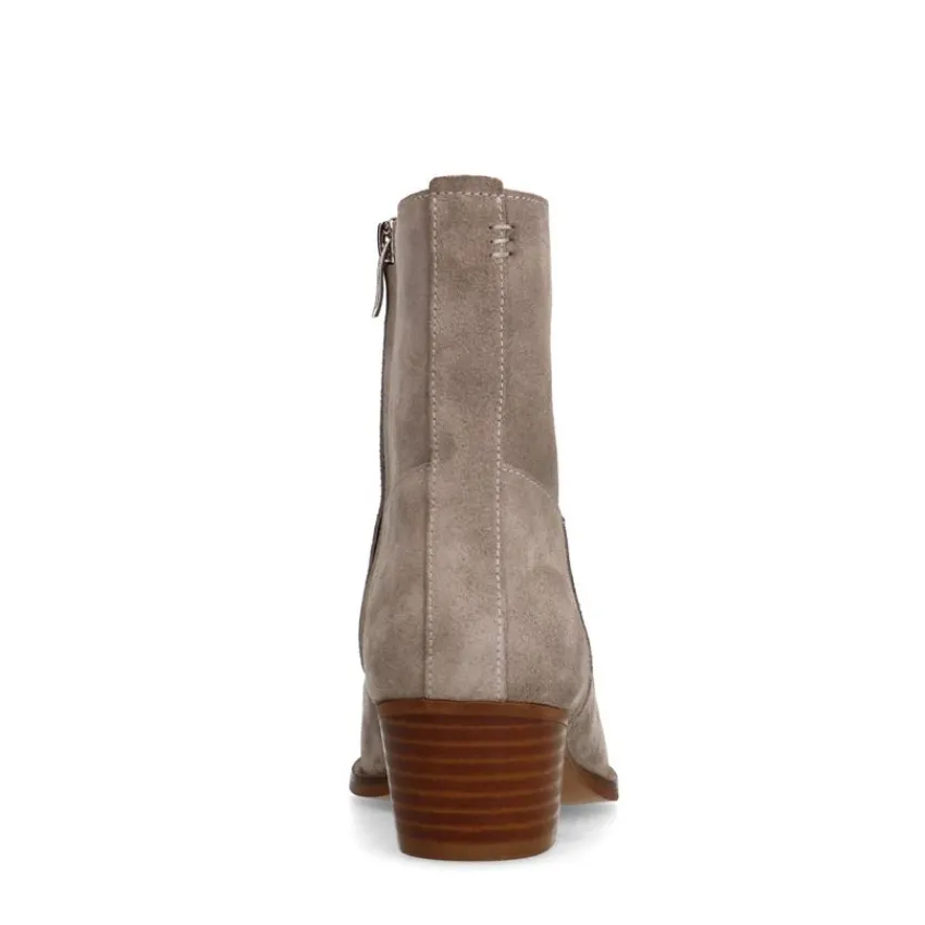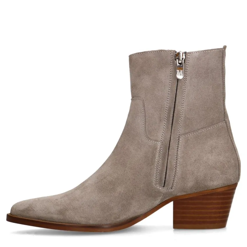 Grijze suède enkellaarsjes met hak van Manfield. De enkellaarsjes hebben een rits aan de binnenzijde en een schuin afgesneden blokhak van 5 cm. We adviseren als verzorging en bescherming de suède/nubuck spray in transparant.