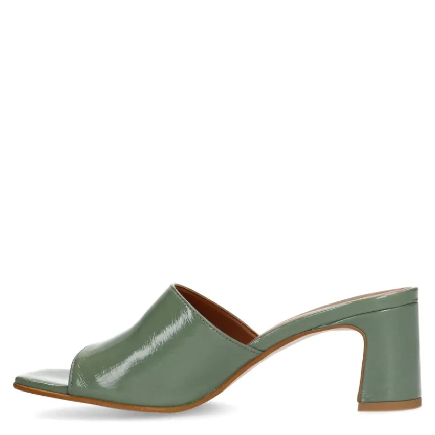 Groene lakleren sandalen met hak van Manfield met blokhak van 6 cm. We adviseren als verzorging en bescherming de Collonil Carbon Pro.