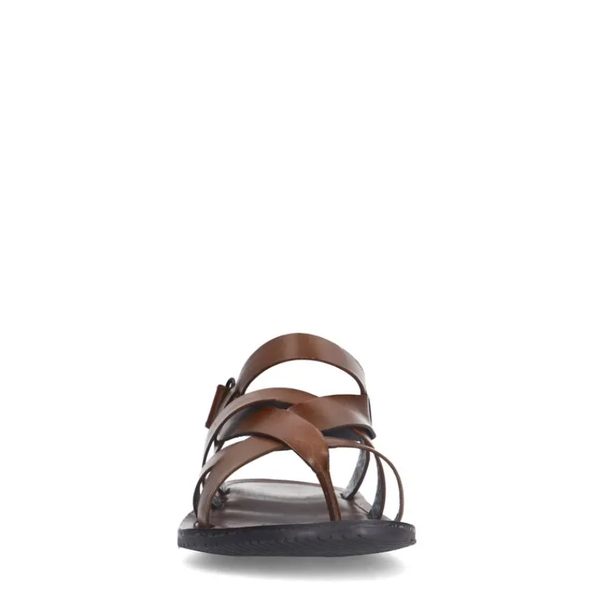 Leren gevlochten cognac slippers van Manfield met bandje en klittenbandsluiting. We adviseren als verzorging en bescherming de Collonil Carbon Pro.