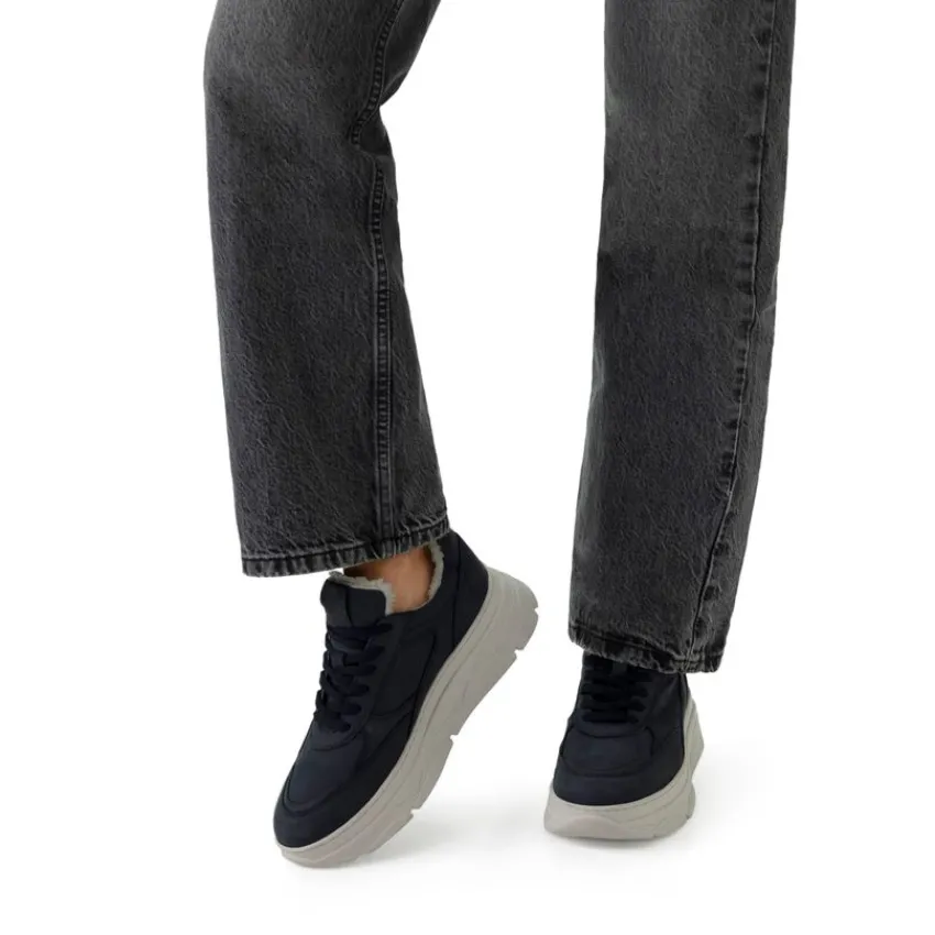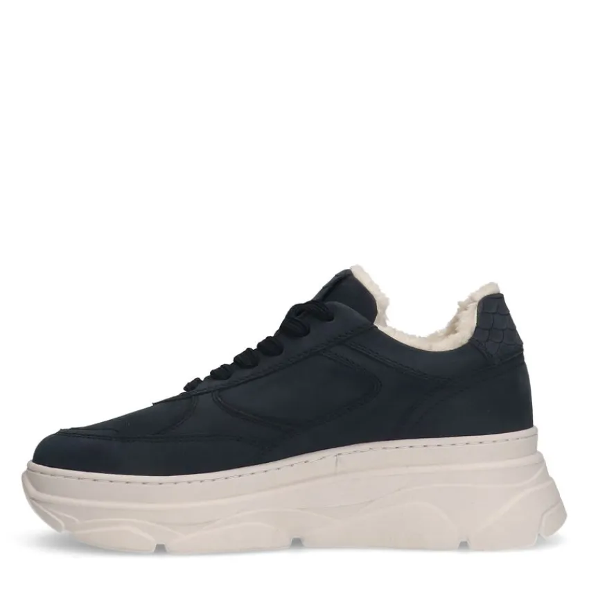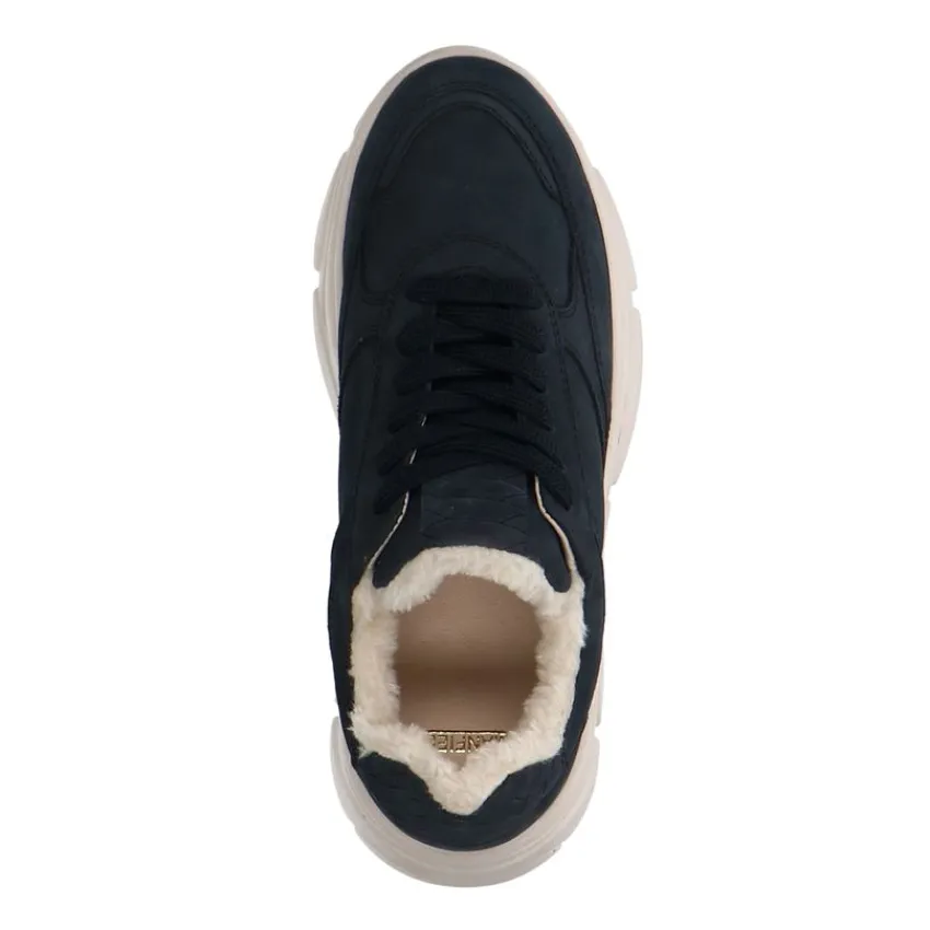 Navy blauwe nubuck sneakers van Manfield met gevoerde binnenkant en witte zool van 4 cm. We adviseren als verzorging en bescherming de suède/nubuck spray in transparant.