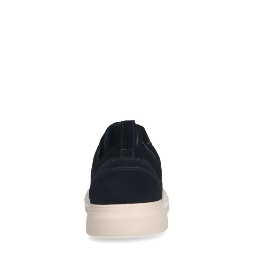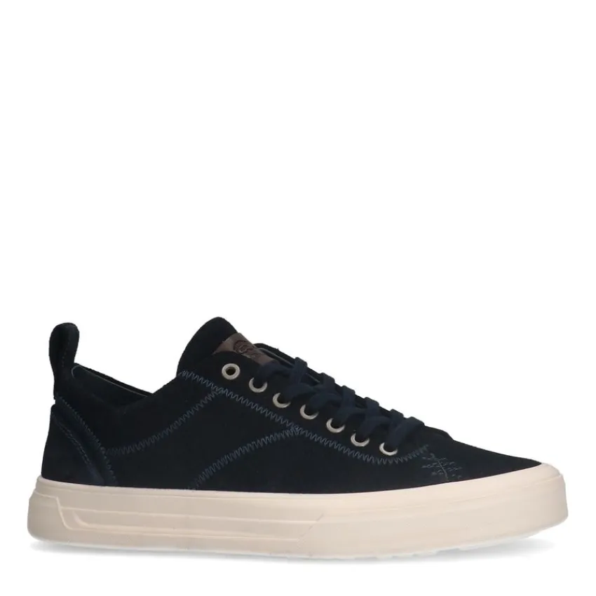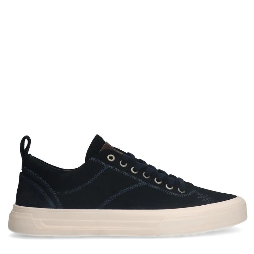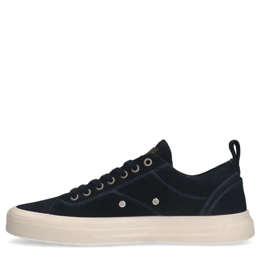 Navy suède sneakers van Manfield met een crème zool van 3 cm. We adviseren als verzorging en bescherming suède/nubuck spray in transparant.