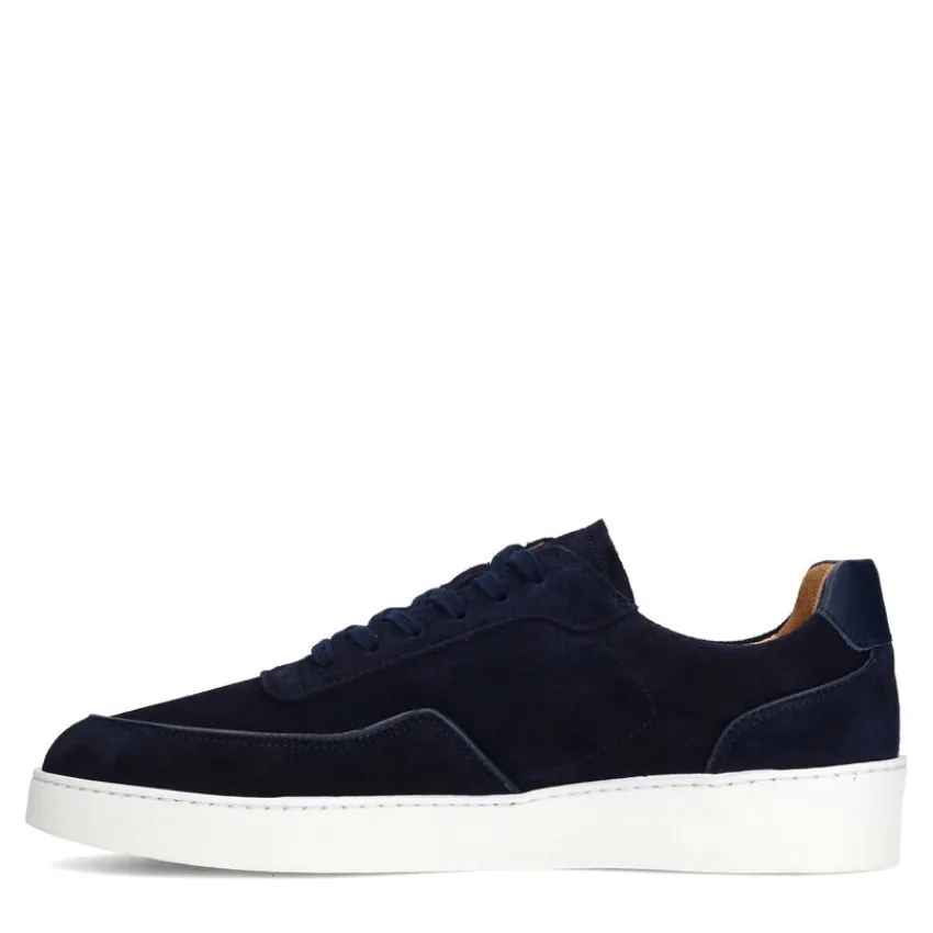 Navy suède sneakers van Manfield met witte zool van 3 cm. We adviseren als verzorging en bescherming de suède/nubuck spray in transparant.