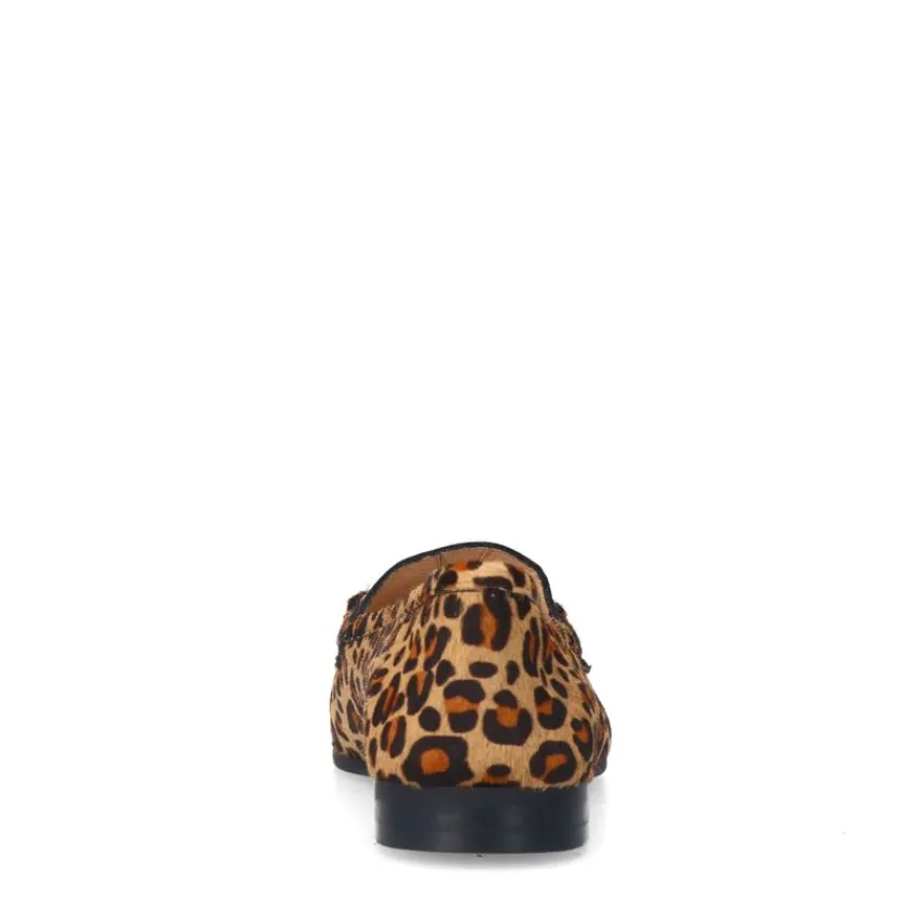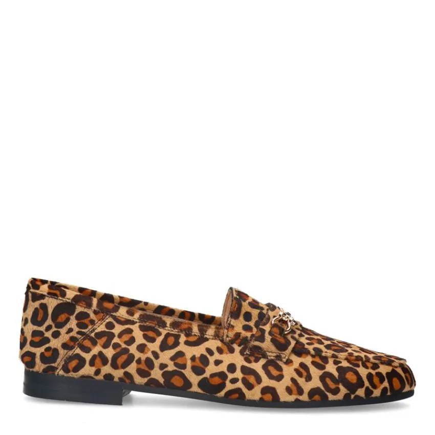 Panter loafers van Manfield met gouden detail op de voorvoet, platte hak van 2 cm en imitatievacht. We adviseren als verzorging en bescherming de Natural Trendspray.