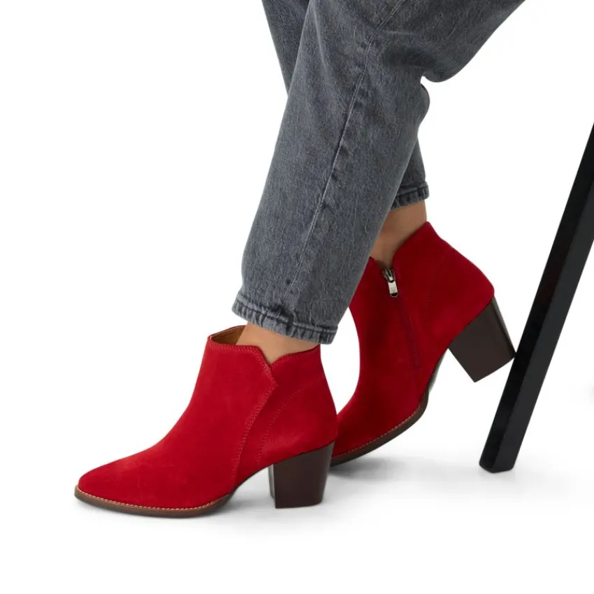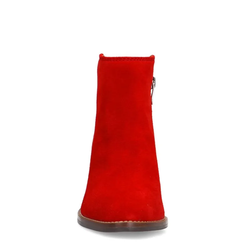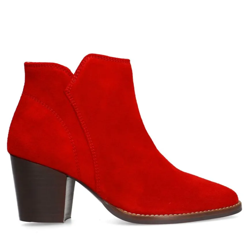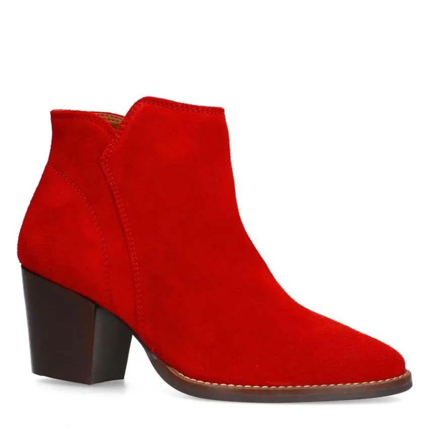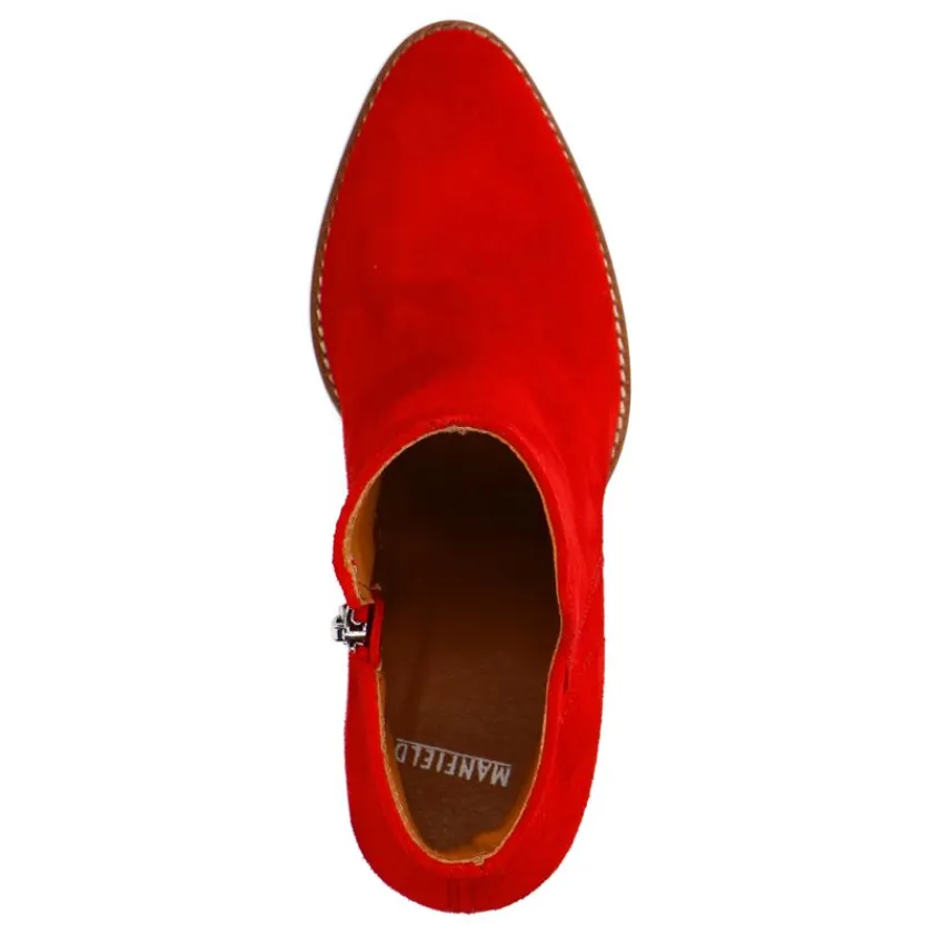 Rode suède enkellaarsjes met hak van Manfield. De enkellaarsjes hebben een puntige neus, ritssluiting aan de binnenzijde en blokhak van 7 cm. We adviseren als verzorging en bescherming de suède/nubuck spray in transparant.