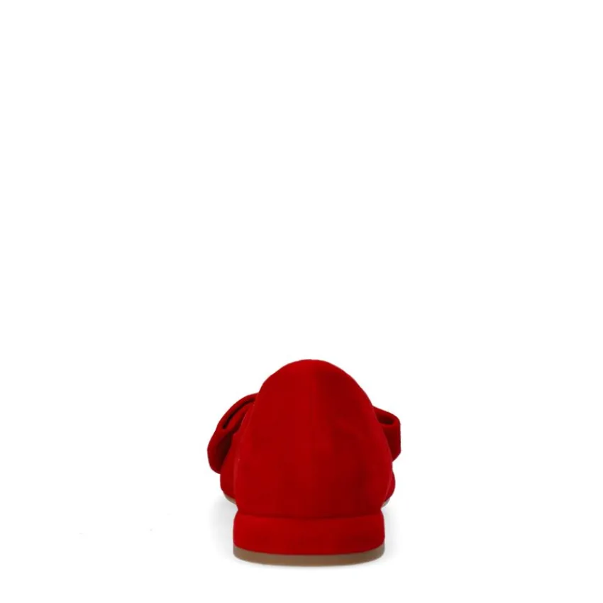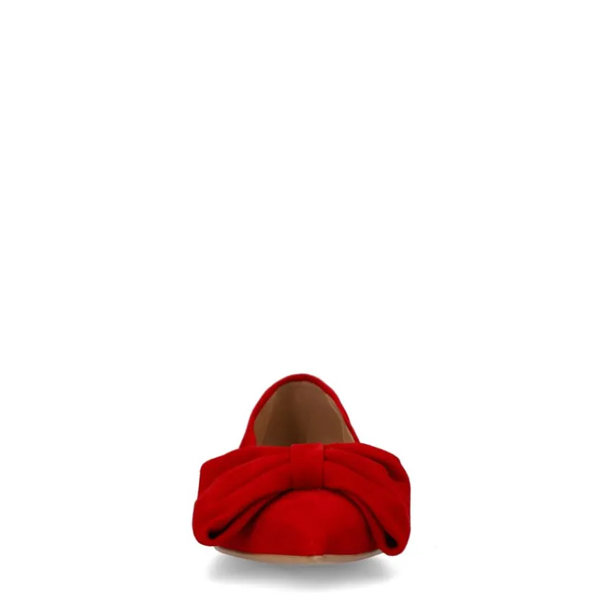 Rode suède loafers met strik van Manfield. De loafers hebben een platte hak van 2 cm hoog en een puntige neus. We adviseren de schoenen te verzorgen en beschermen met de Collonil Carbon Pro.