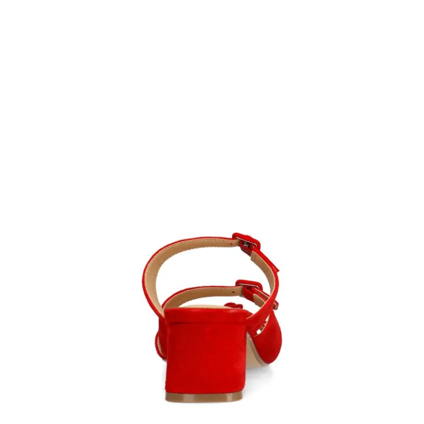 Rode suède sandalen met hak en gespjes van Manfield. De sandalen hebben een blokhak van 5 cm. We adviseren als verzorging en bescherming de suède/nubuck spray in transparant.