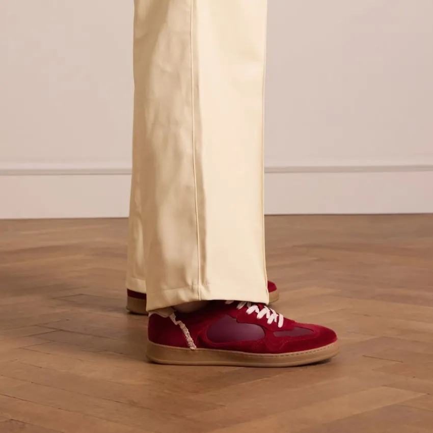 Rode suède sneakers van Manfield met witte vetersluiting, mesh details aan de zijkant en bruine zool van 2 cm. We adviseren als verzorging en bescherming de suède/nubuck spray in transparant.