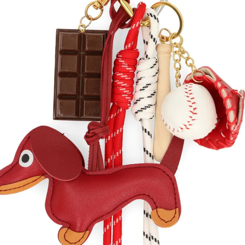 Rode teckel bag charm van Manfield met baseball details. De bagcharm heeft rode & witte touwtjes en een chocolade detail met een hartjes vormige sluiting.