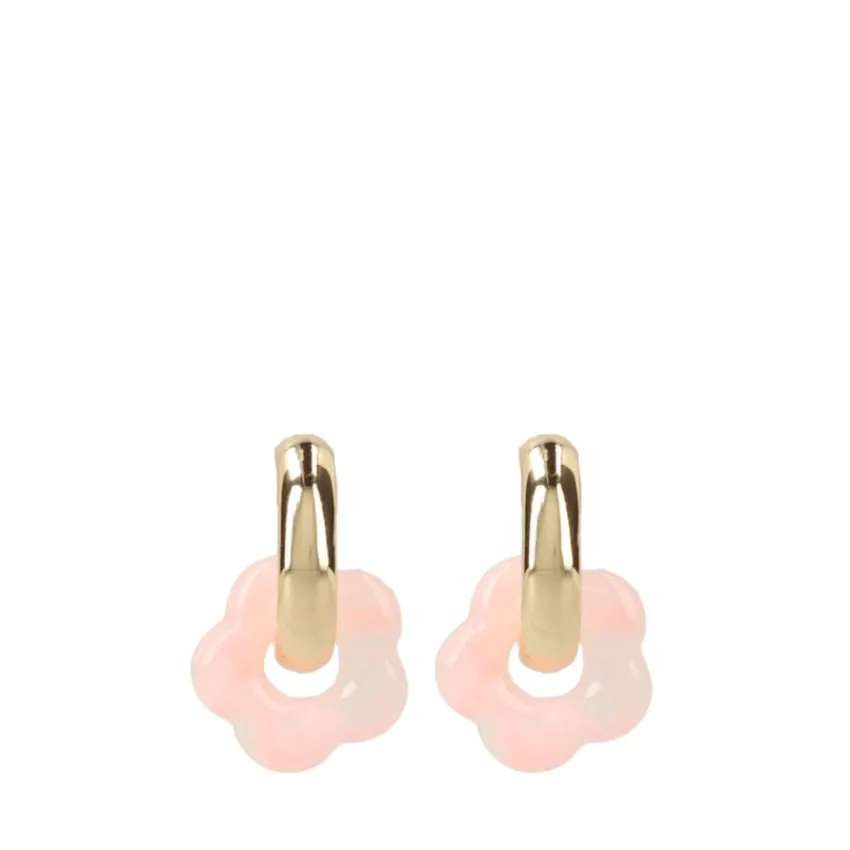 Roze bloemen oorbellen met gouden details van Manfield. De oorbellen hebben een lengte van 4 cm.