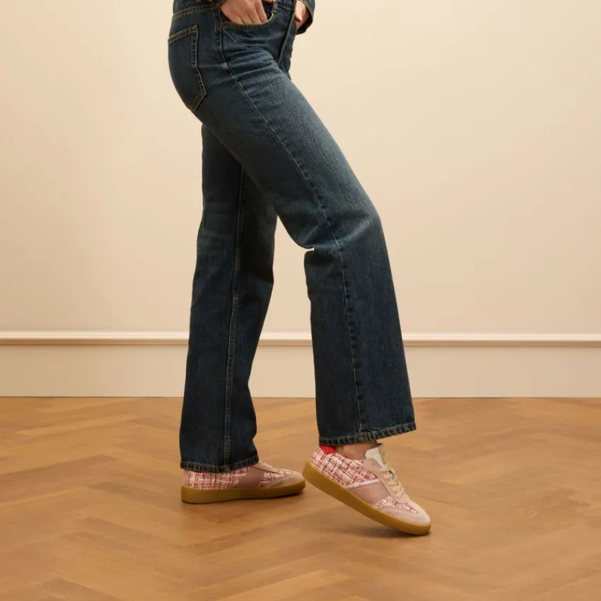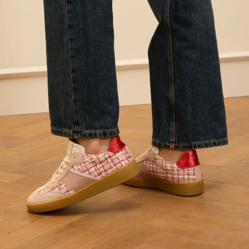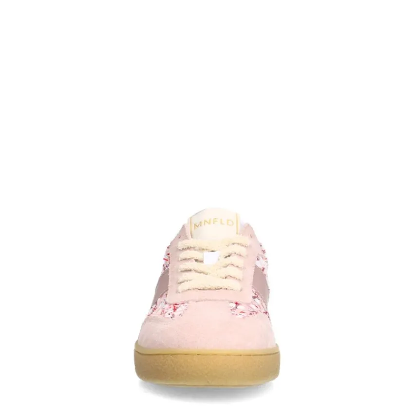 Roze bouclé sneakers van Manfield met leren details. De sneakers hebben een bruine rubberen zool. We adviseren als verzorging en bescherming de Natural Trendspray.