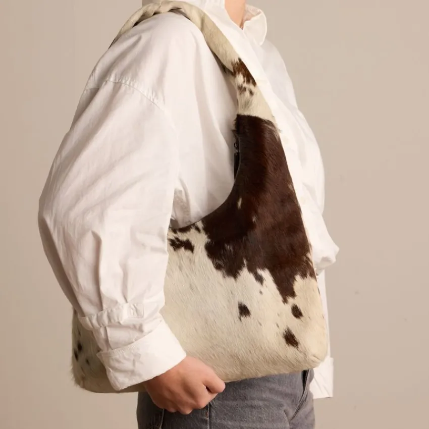 Schoudertas met cowprint van Manfield met een ritssluiting. LET OP – de tas is gemaakt van natuurlijk materiaal, hierdoor heeft elk item een unieke print. De afmeting van de tas is 37x25x4 cm, (BxHxD).
