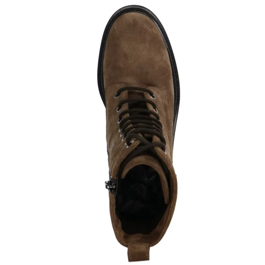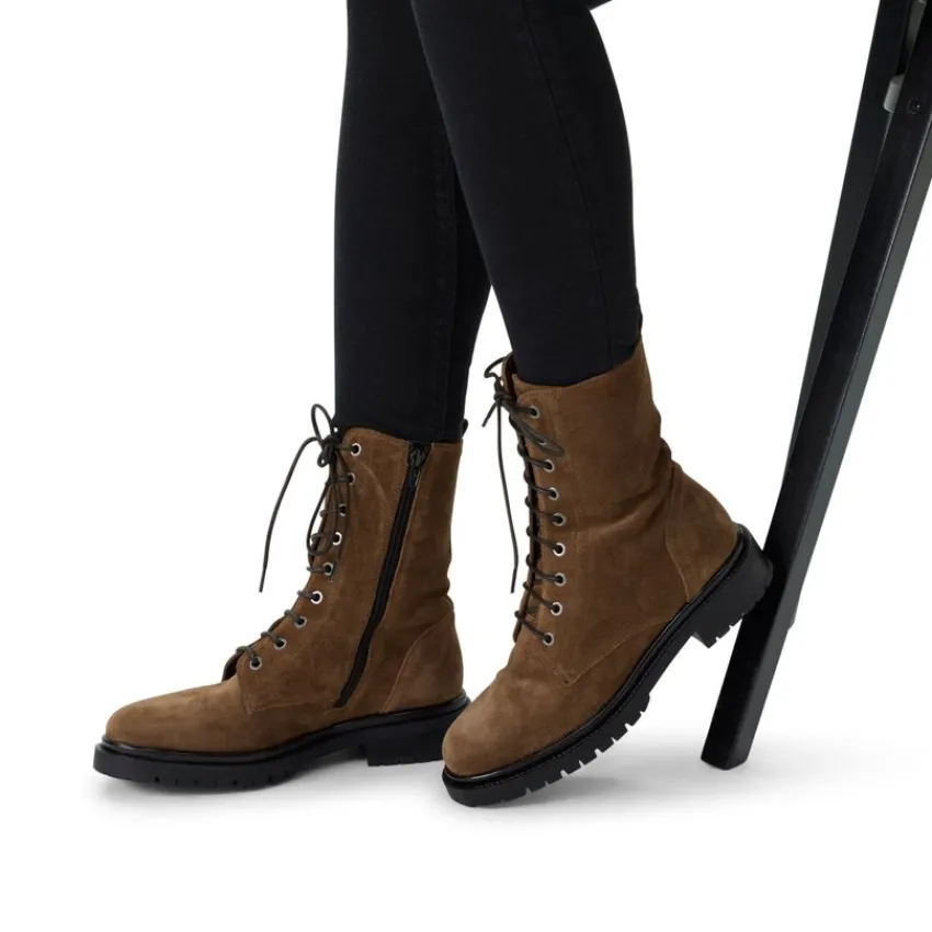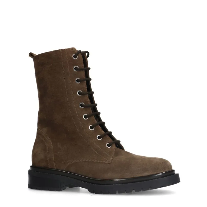 Taupe suède veterlaarsjes van Manfield met een ritssluiting aan de binnenzijde en een platte hak van 2 cm. We adviseren als verzorging en bescherming de suède/nubuck spray in transparant.