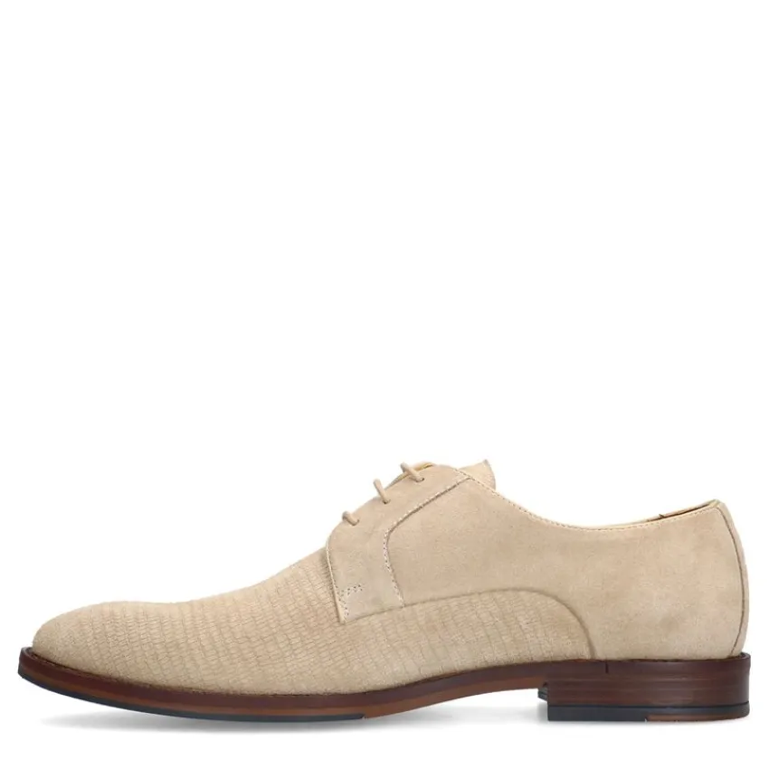 Taupe suède veterschoenen van Manfield met platte hak van 2 cm. We adviseren als verzorging en bescherming suède/nubuck spray in transparant.