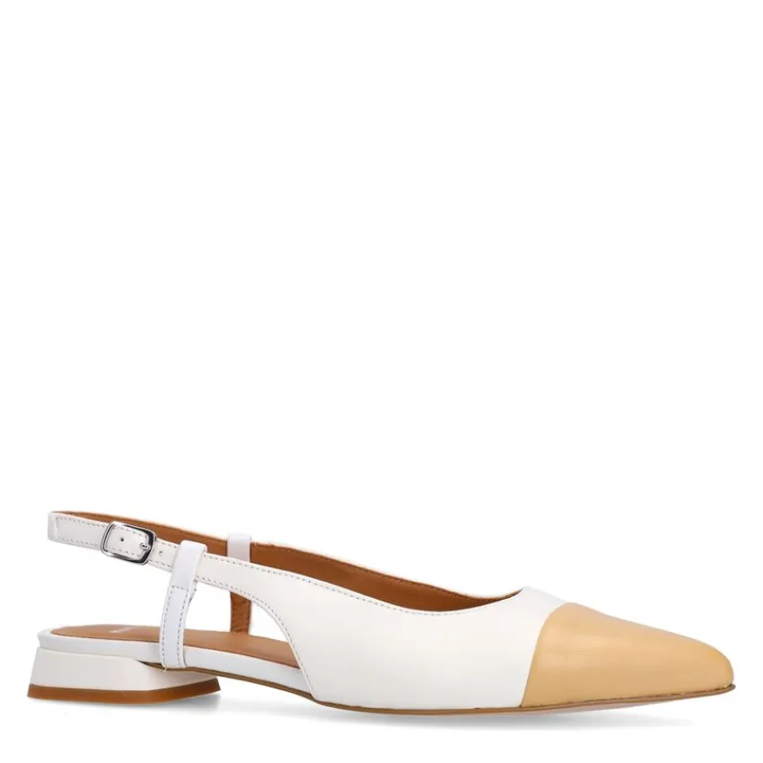 Witte leren slingbacks van Manfield met puntige cognac neus, platte hak van 1 cm en gespsluiting rondom de enkels. We adviseren als verzorging en bescherming de Collonil Carbon Pro.