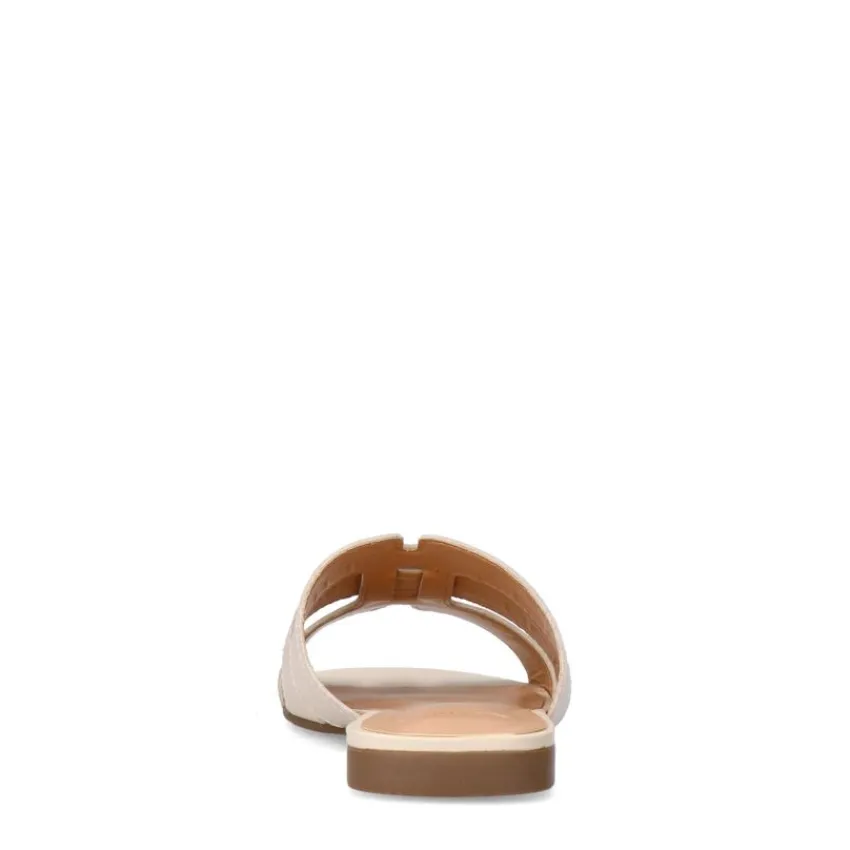 Witte leren slippers van Manfield met platte hak van 1 cm en brede band over de voorvoet. We adviseren als verzorging en bescherming de Collonil Carbon Pro.