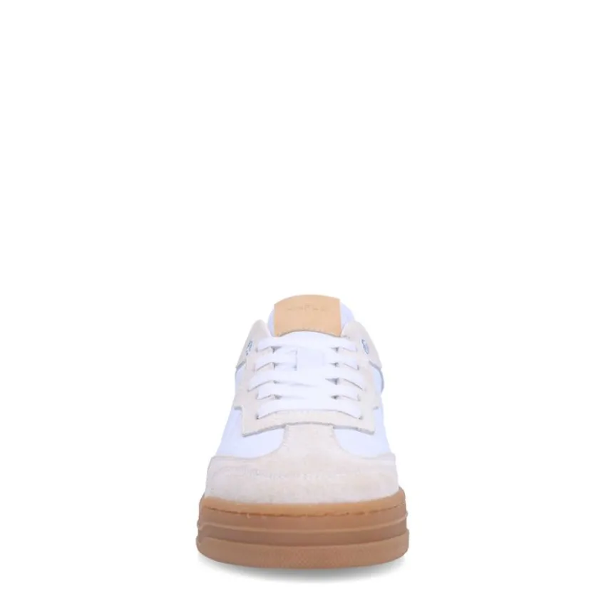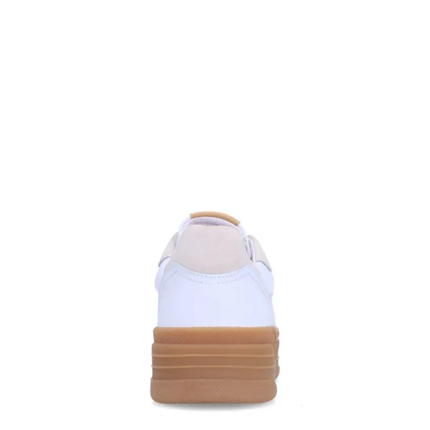 Witte leren sneakers met beige suéde details van Manfield met bruine plateau zool van 4 cm, we adviseren als verzorging en bescherming de Collonil Carbon Pro spray.
