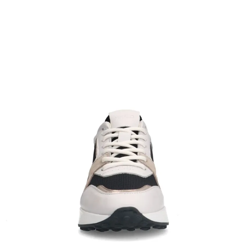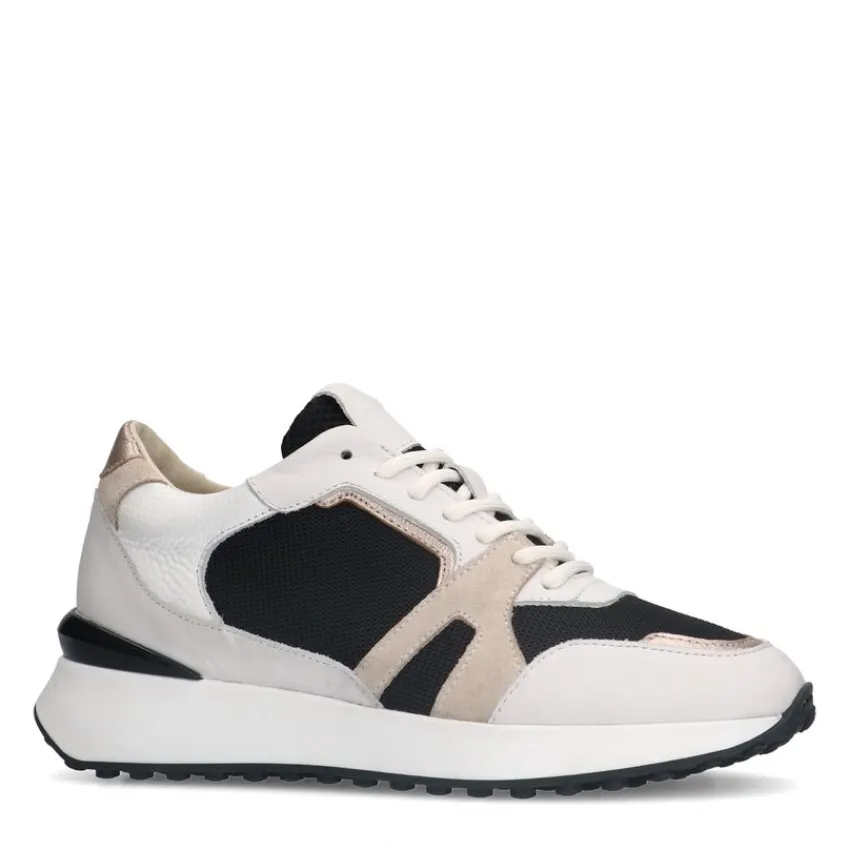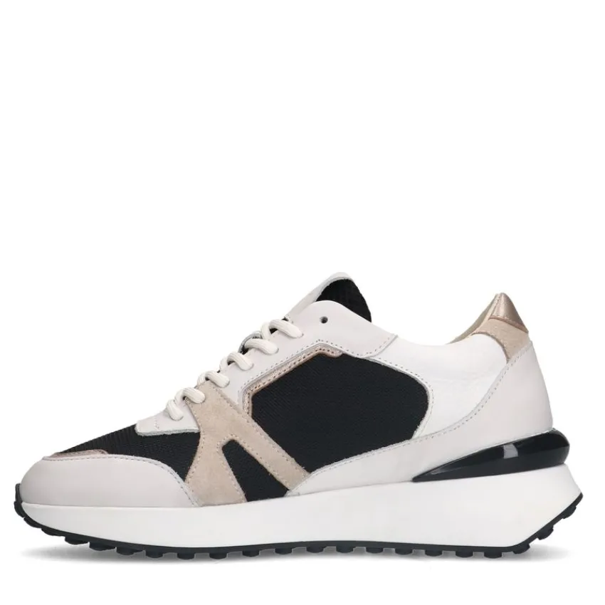 Witte leren sneakers met mesh details van Manfield. De sneakers hebben een witte zool van 3 cm en een uitneembare binnenzool. We adviseren als verzorging en bescherming de Collonil Carbon Pro.