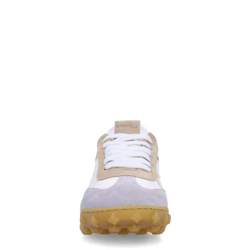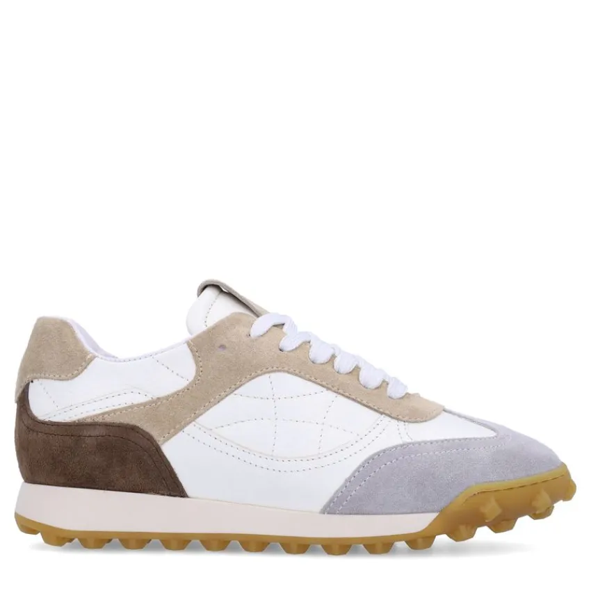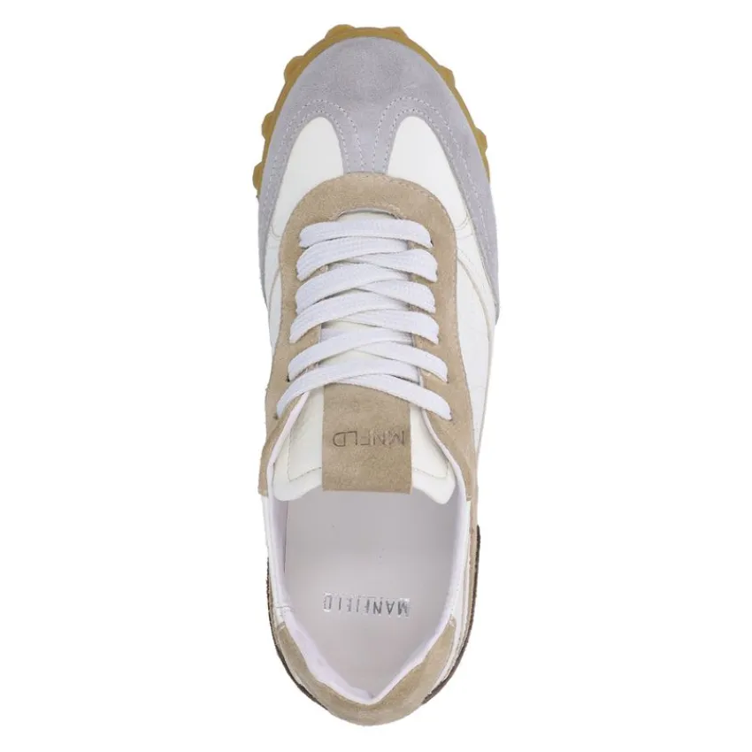 Witte leren sneakers met taupe suède details van Manfield. De sneakers hebben een witte zool van 3 cm. We adviseren als verzorging en bescherming de Collonil Carbon pro.