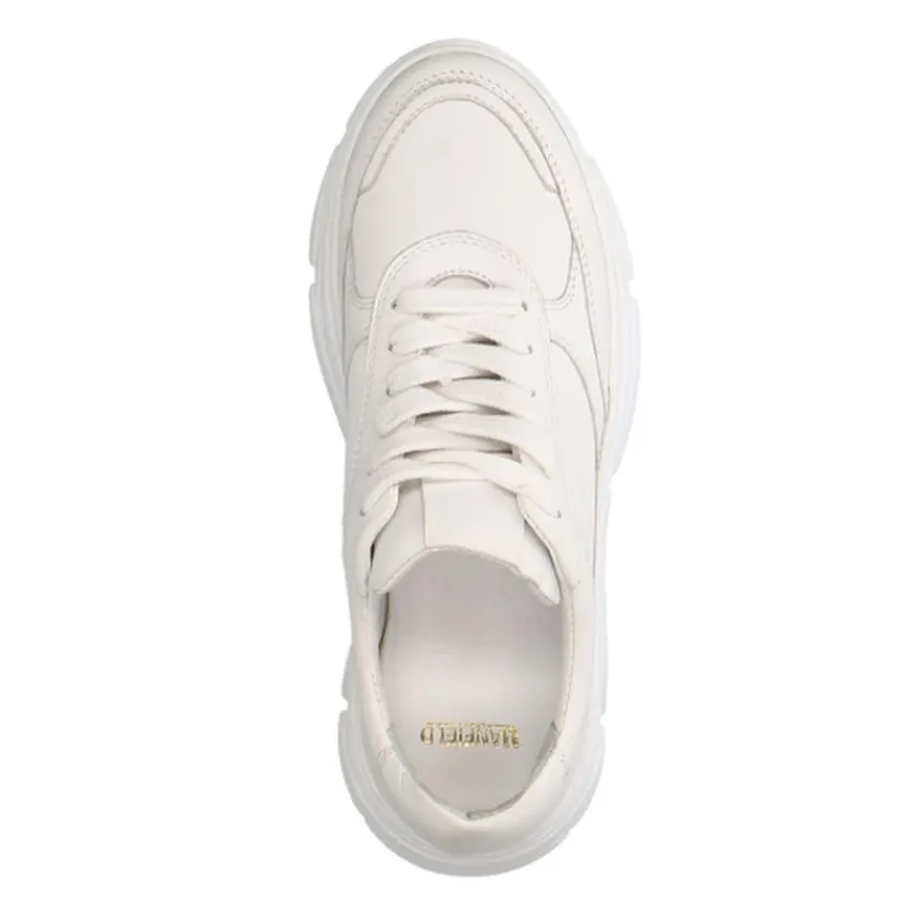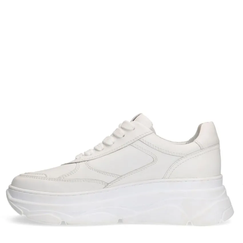 Witte leren sneakers van Manfield met een uitneembare binnenzool en plateau hoogte van 5 cm. We adviseren als verzorging en bescherming de Collonil Carbon Pro.