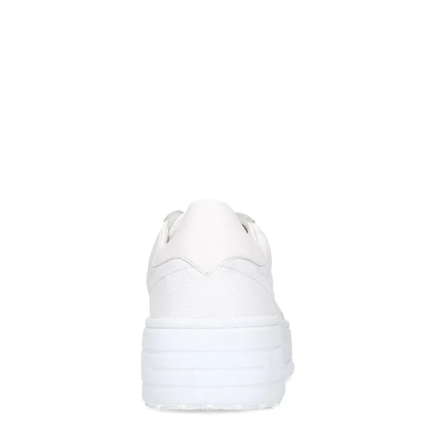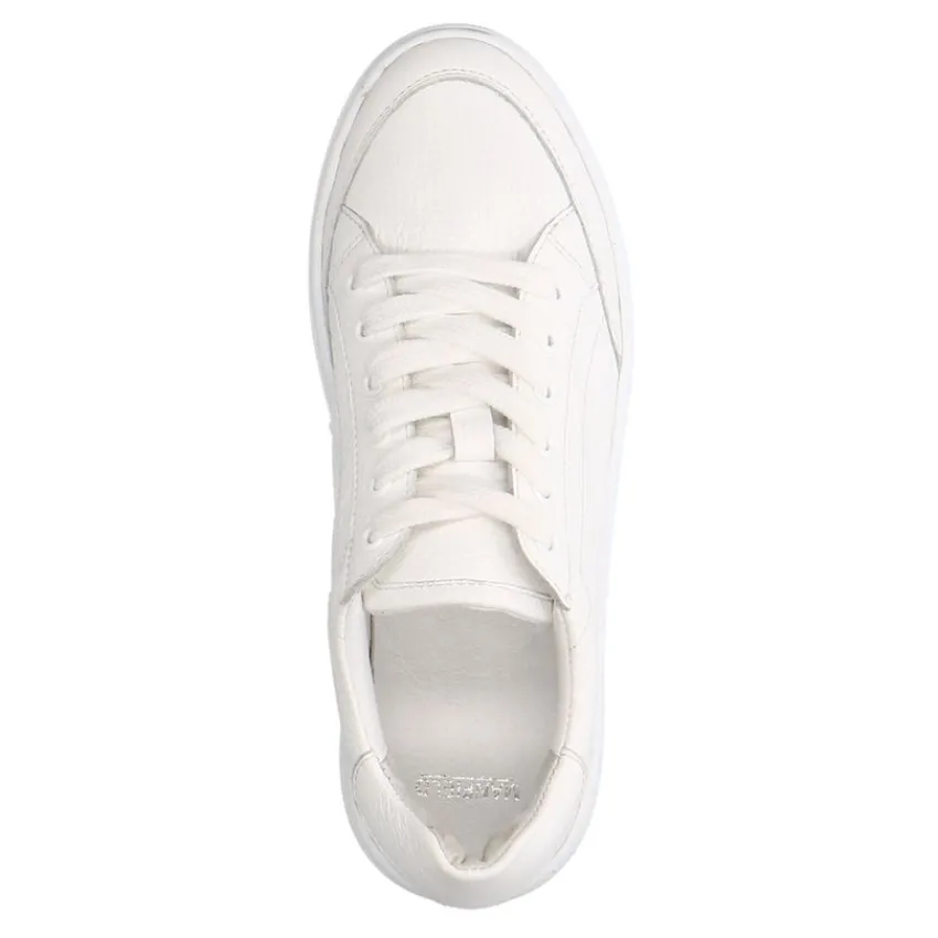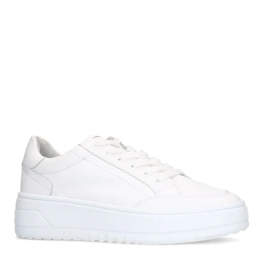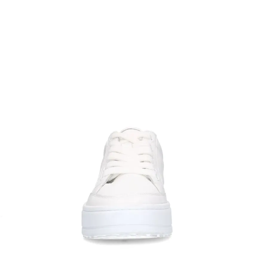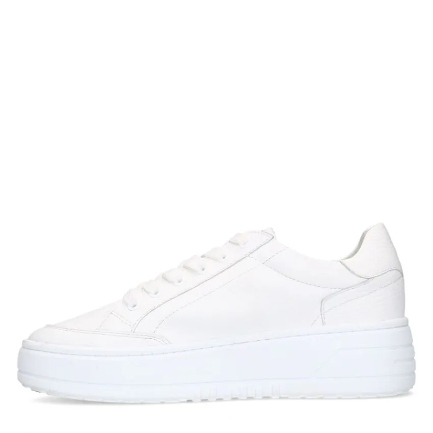 Witte leren sneakers van Manfield met witte zool van 2,5 cm. We adviseren als verzorging en bescherming de Collonil Carbon Pro.