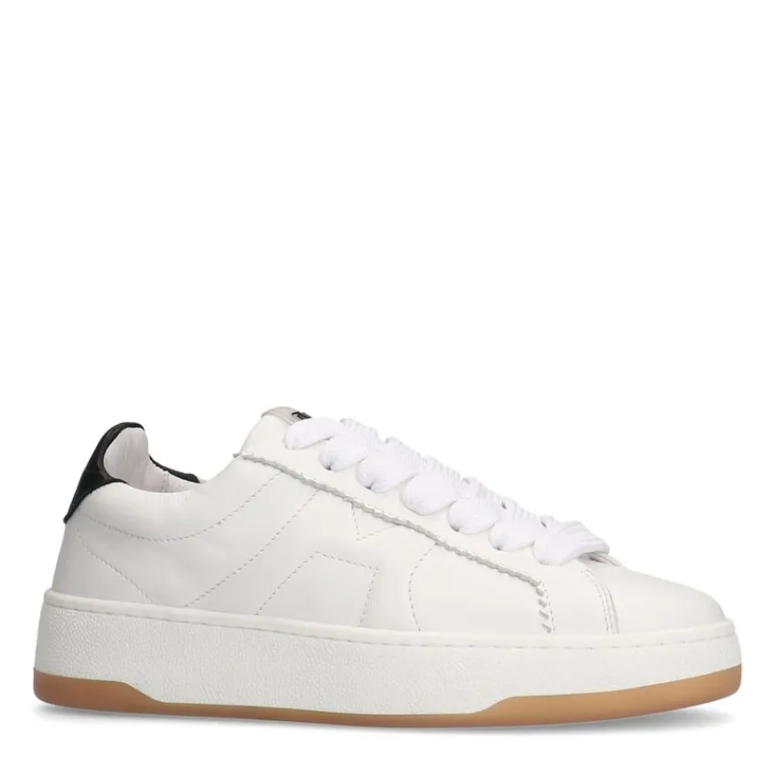 Witte leren sneakers van Manfield met witte zool van 2 cm en uitneembare binnenzool. We adviseren als verzorging en bescherming de Collonil Carbon Pro.