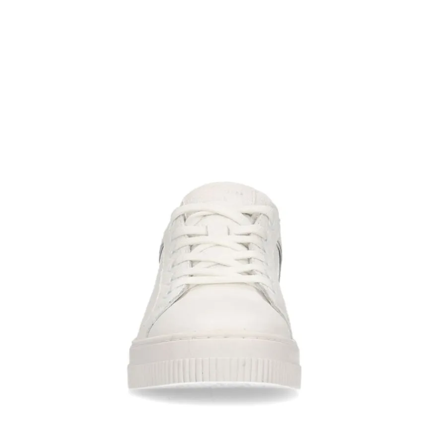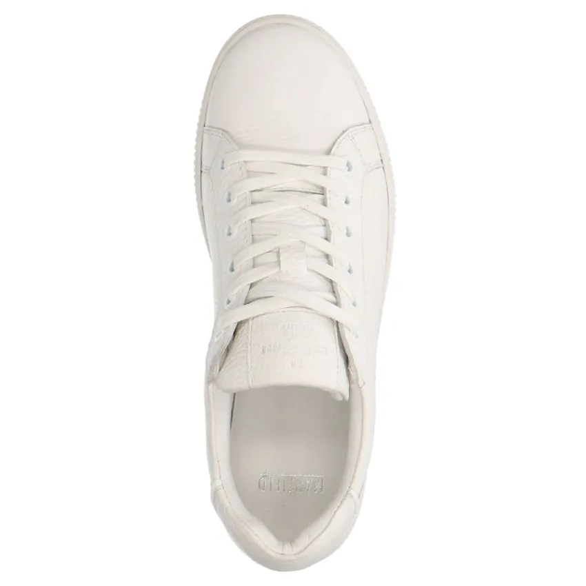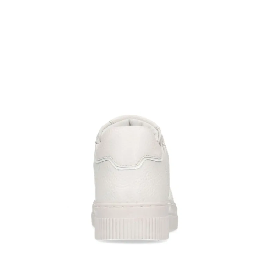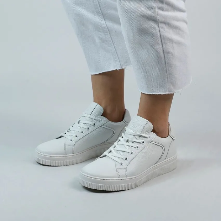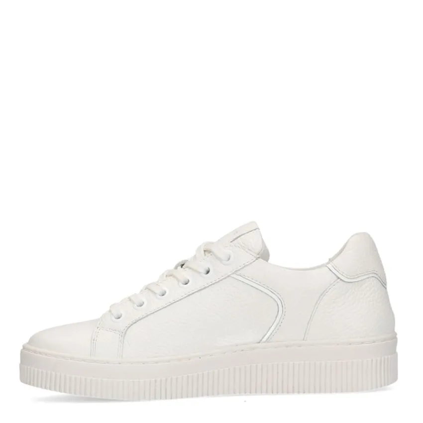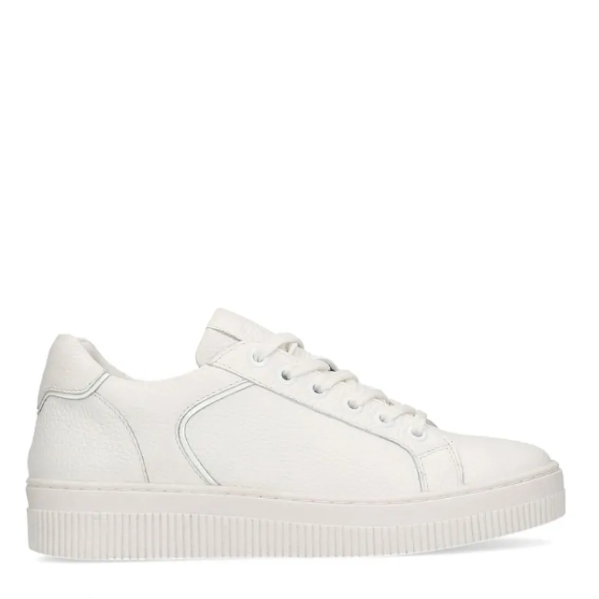 Witte leren sneakers van Manfield met witte zool van 2 cm. We adviseren als verzorging en bescherming de Collonil Carbon Pro.