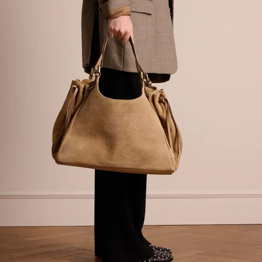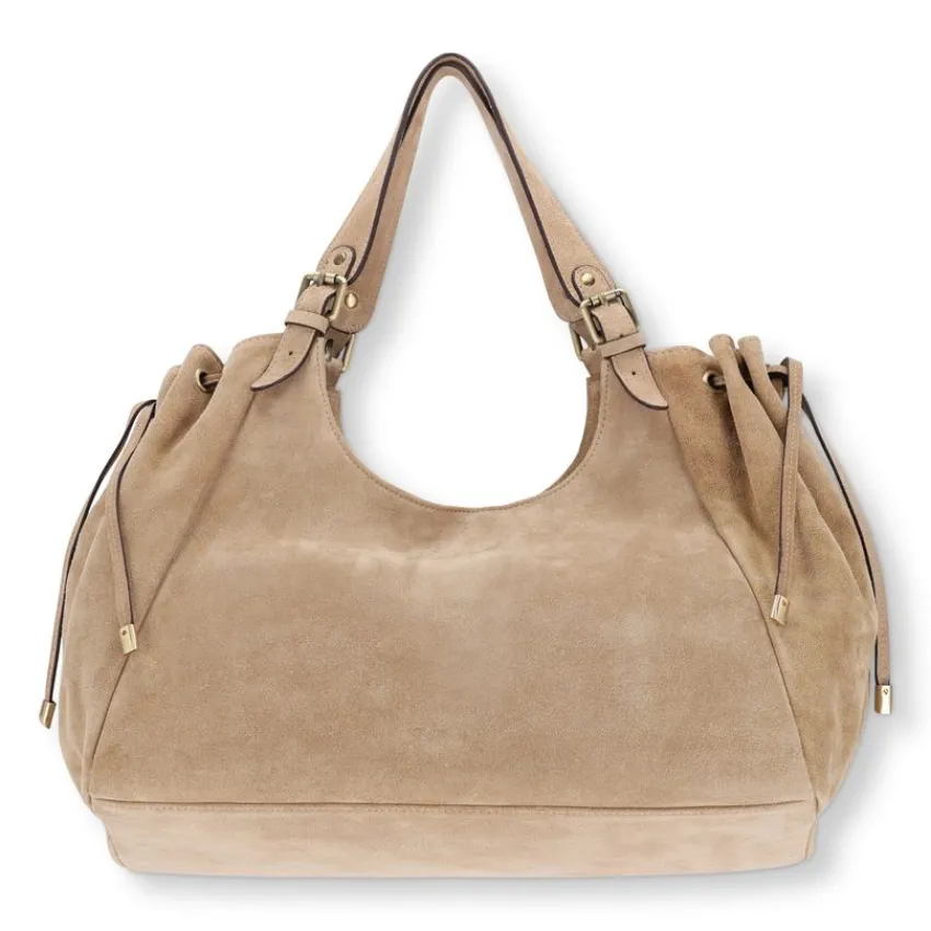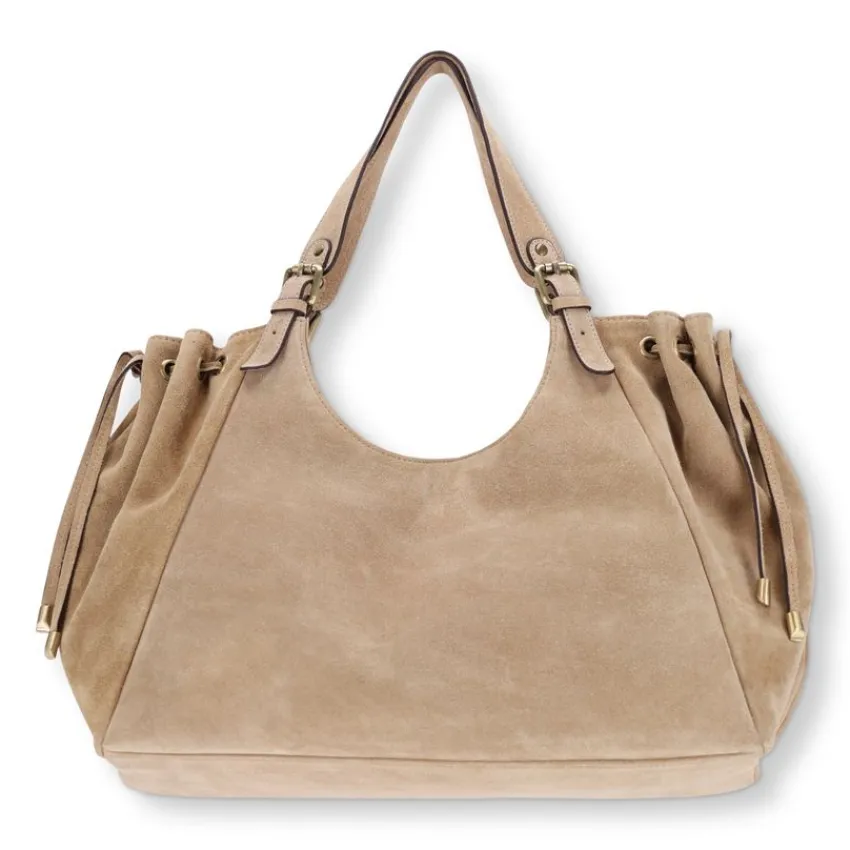 Zandkleurige suède shopper van Manfield met drukknoop sluiting en zijvakken aan de binnenzijde. De afmeting van de tas is 51x32x20 cm (BxHxD).
