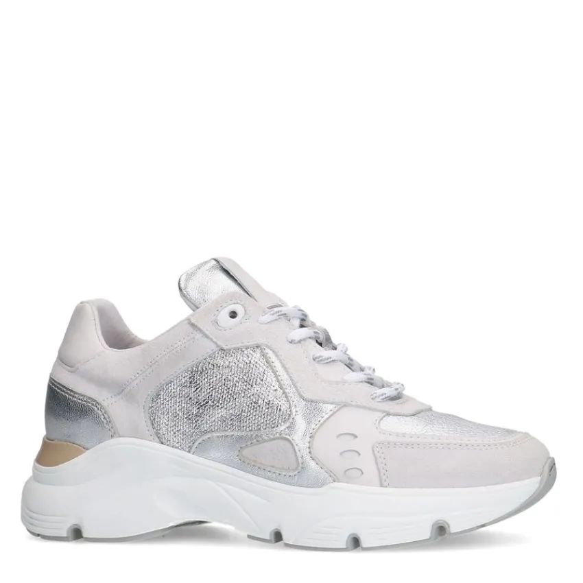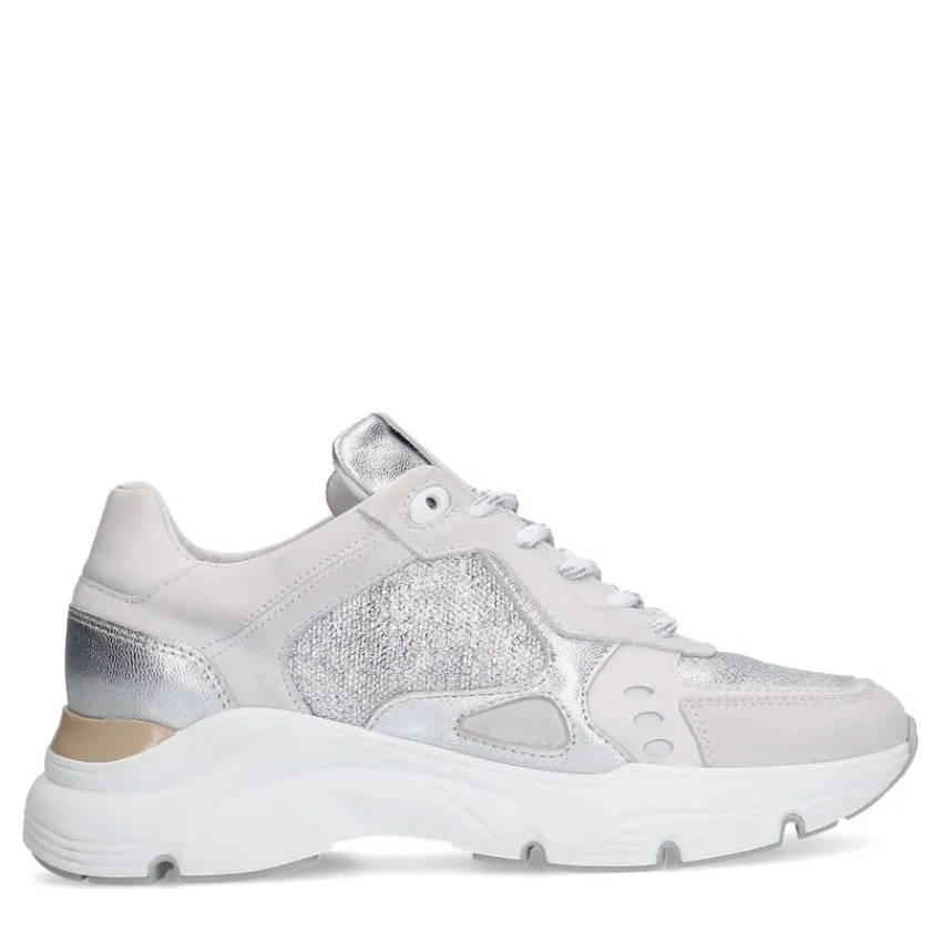 Zilveren leren sneakers van het merk Manfield. De zool heeft een hoogte van 4 cm. De schoen heeft zilveren metallic en glitter details. Stijl de sneakers onder een jeans en maak je look een stukje eleganter.