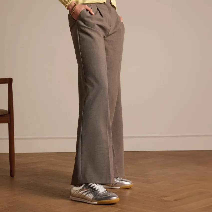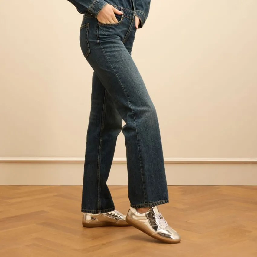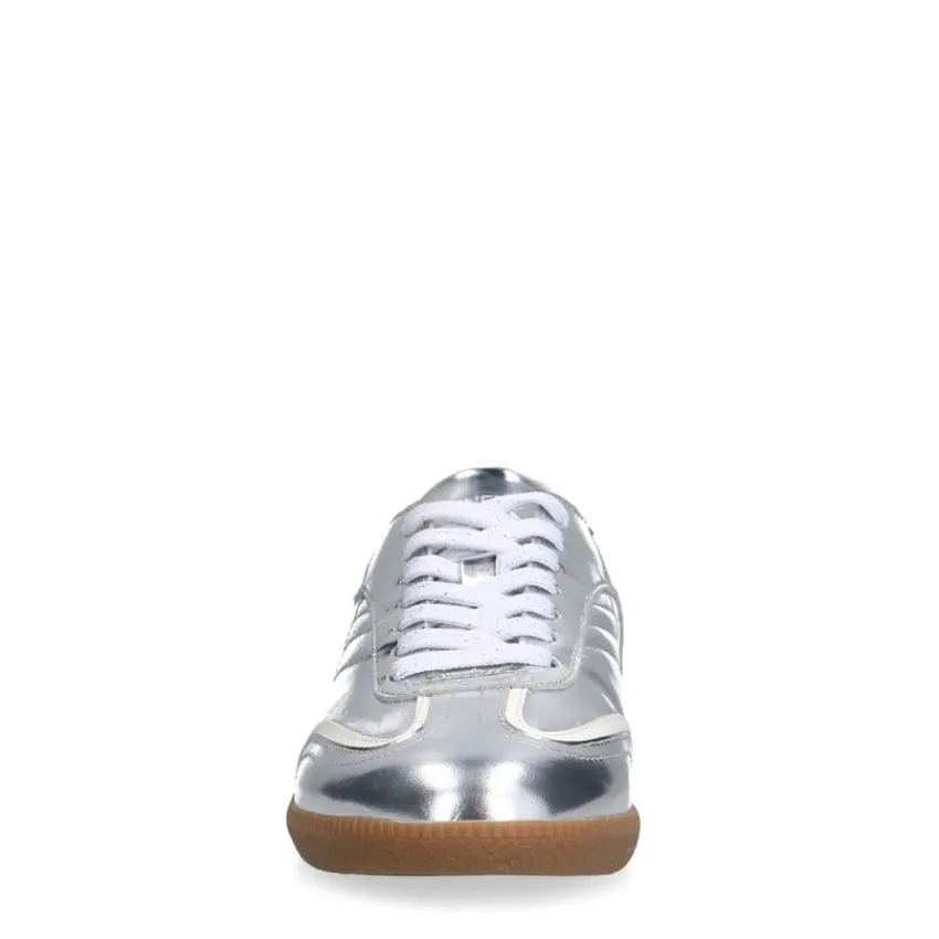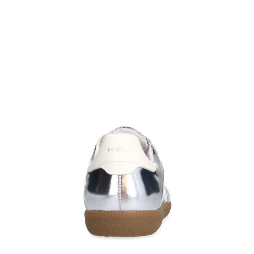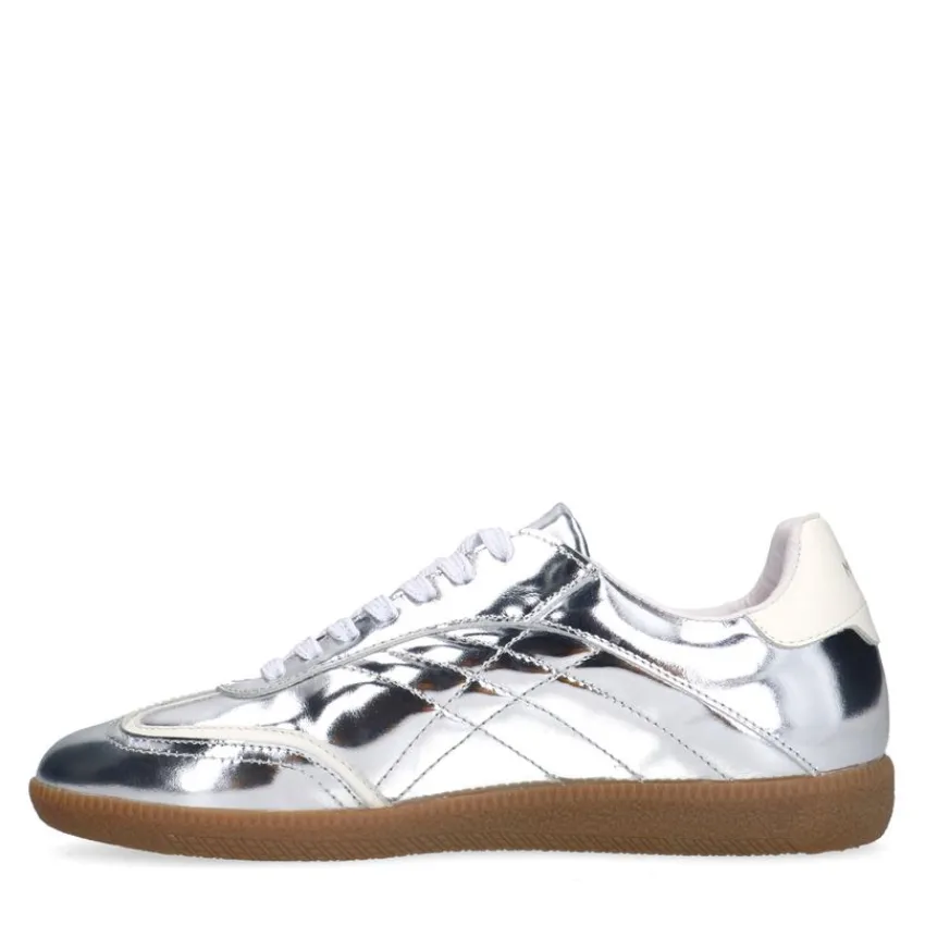 Zilveren leren sneakers van Manfield met bruine zool van 2 cm en een uitneembare binnenzool. We adviseren als verzorging en bescherming de Collonil Carbon Pro.