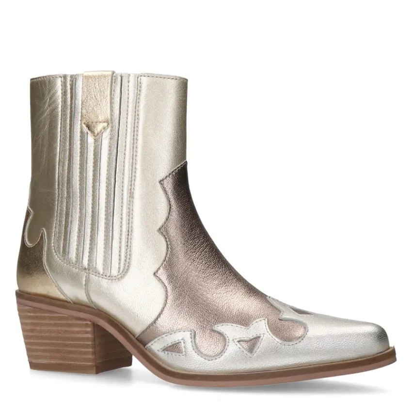 Zilveren metallic leren cowboy laarzen van Manfield met een schuin afgesneden blokhak van 5 cm en een puntige neus. De laarzen hebben een uniek design en ritssluiting aan de binnenzijde. We adviseren als verzorging en bescherming de Collonil Metallic spray.