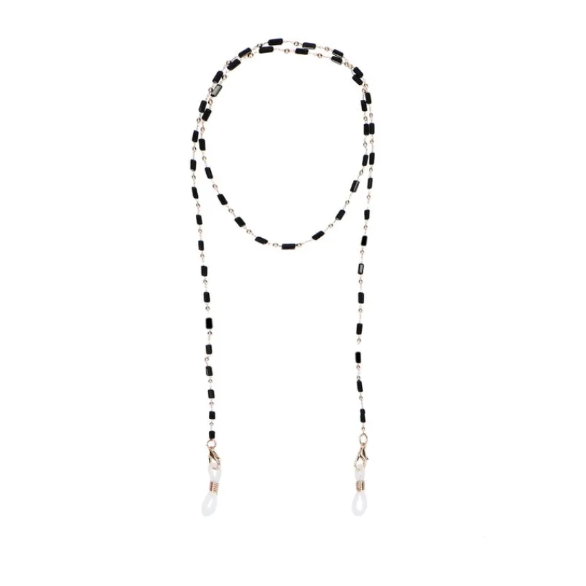 Zwart zonnebril koord van Manfield. Dit zwart met gouden zonnebril koordje is gemaakt van brass steentjes en heeft een lengte van 40 cm. Dit koordje kan rond de pootjes van een zonnebril gewikkeld worden door middel van de doorzichtige elastische ringetjes aan de uiteindes.