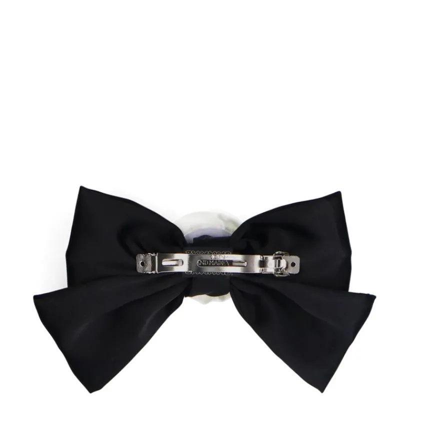 Zwarte haarclip met strik en roos van Manfield. De clip is 10 cm breed en de strik is 19 cm breed.
