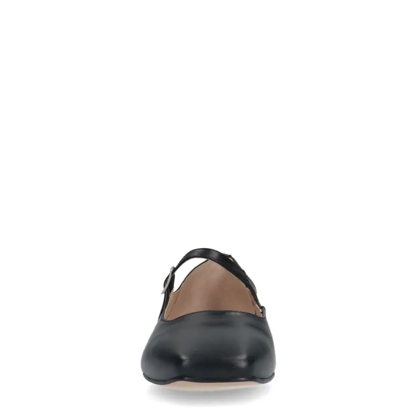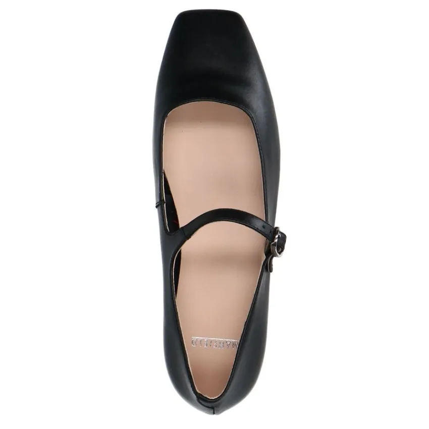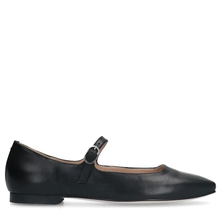 Zwarte leren ballerina’s van Manfield met een gespsluiting en platte hak van 1 cm. We adviseren als verzorging en bescherming de Collonil Carbon Pro.