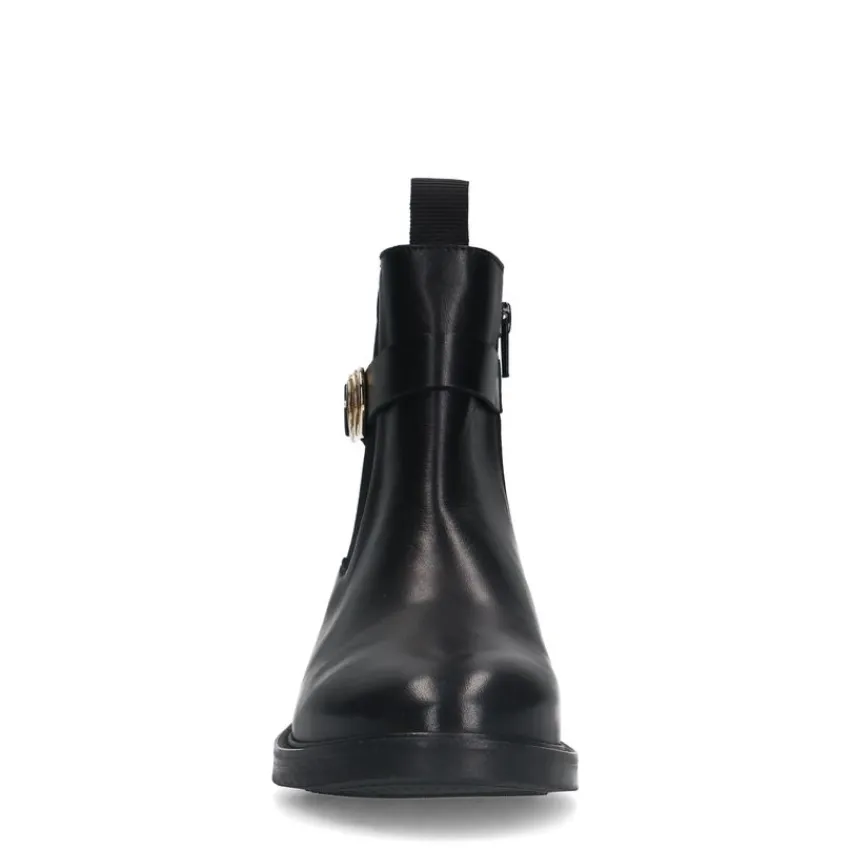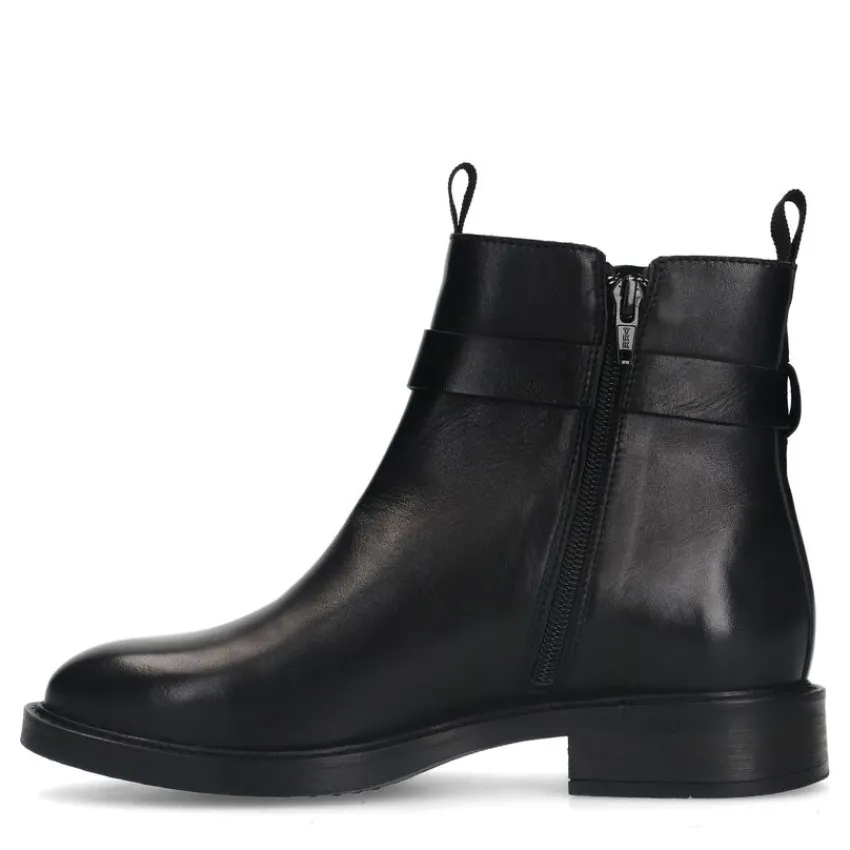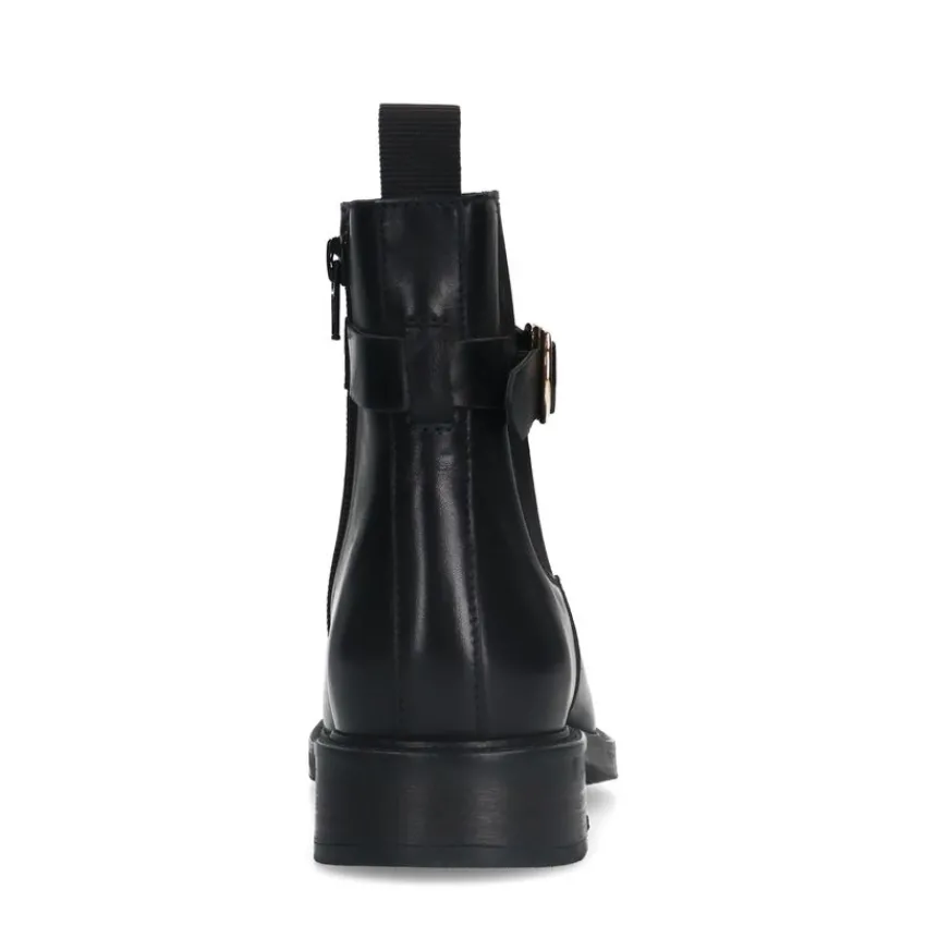 Zwarte leren chelsea boots met gesp van Manfield met een ritssluiting aan de binnenzijde en een platte hak van 2 cm. We adviseren als verzorging en bescherming de Collonil Carbon Pro.