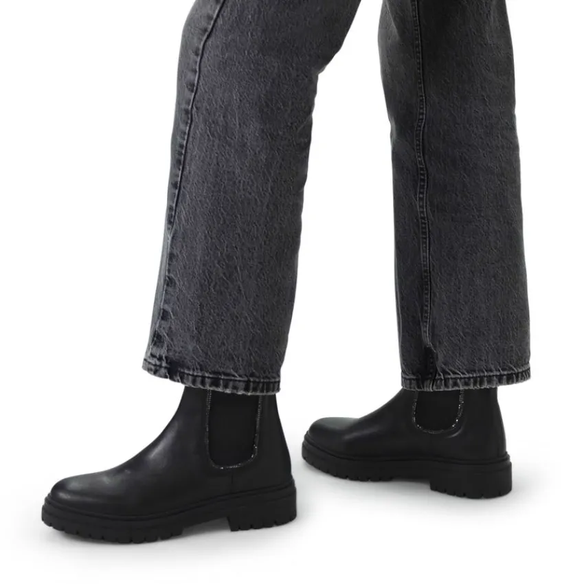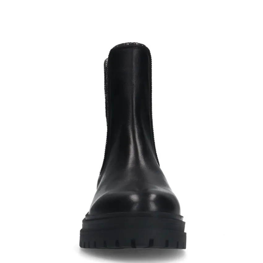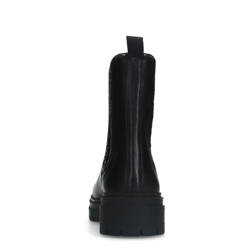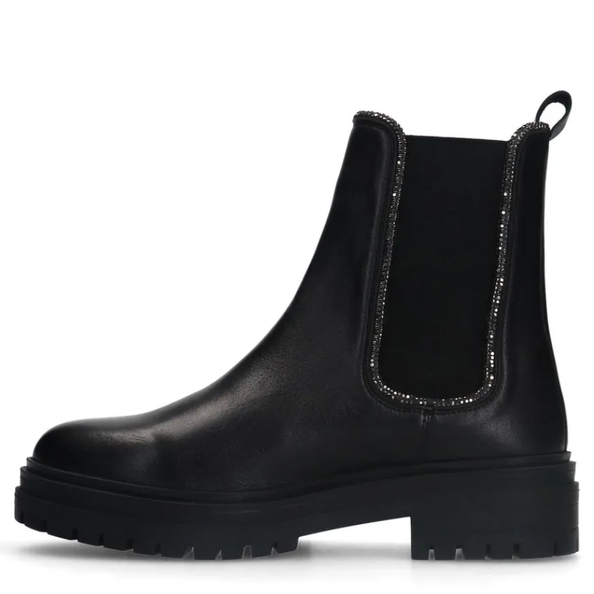 Zwarte leren chelsea boots van Manfield met glitter details. De boots hebben een platte hak van 4 cm, plateauzool van 2,5 cm en elastieken sluiting. We adviseren als verzorging en bescherming de Collonil Carbon Pro.