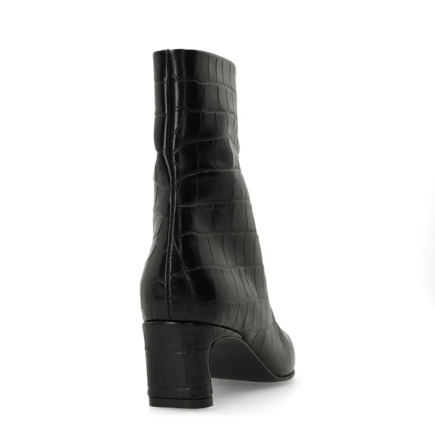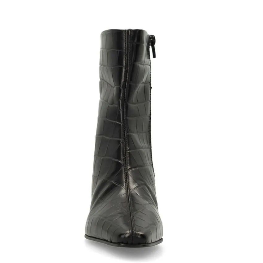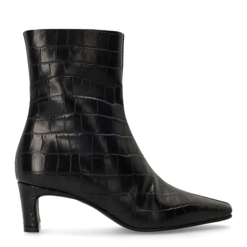 Zwarte leren croco enkellaarsjes met hak van Manfield. De enkellaarsjes hebben een lage hak van 5 cm, vierkante neus en een ritssluiting aan de binnenzijde. We adviseren als verzorging en bescherming de Collonil Carbon Pro.