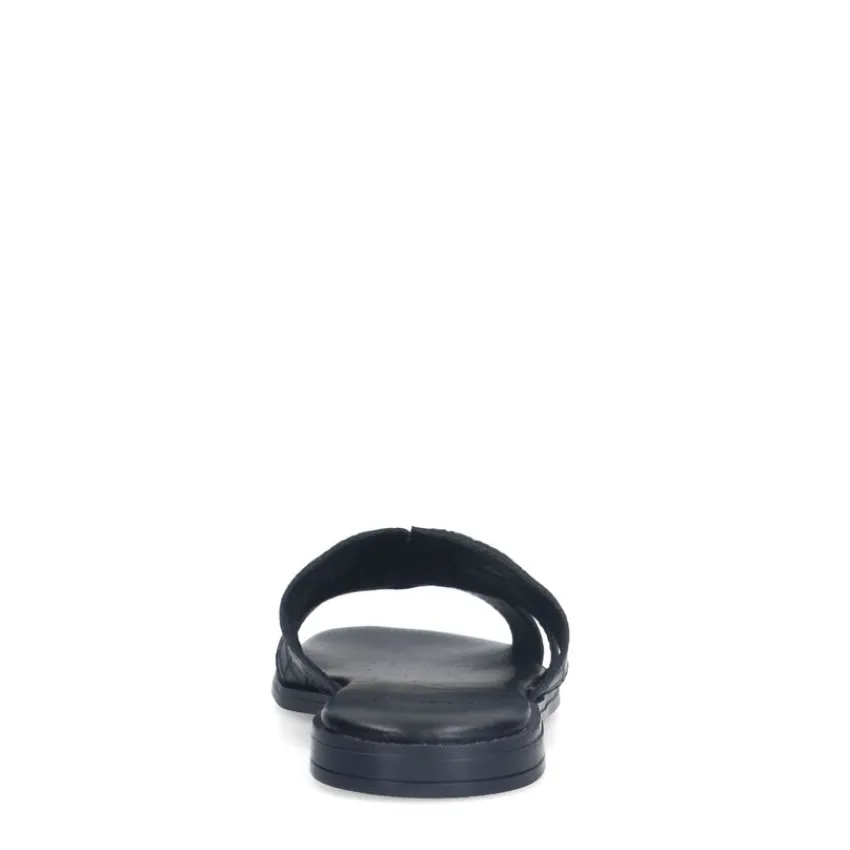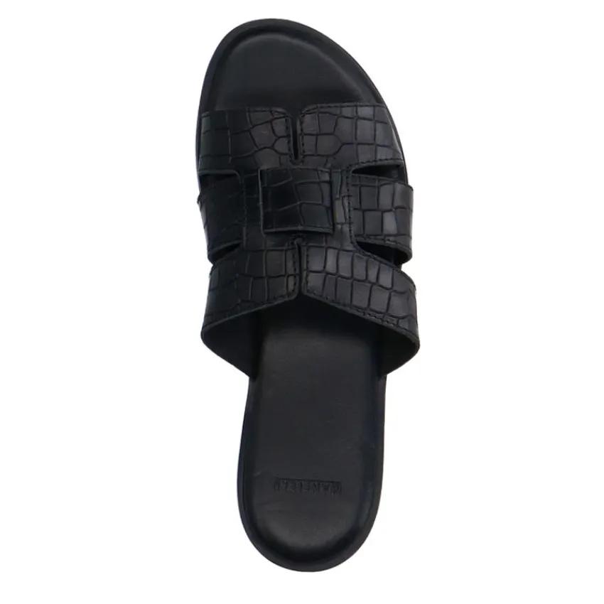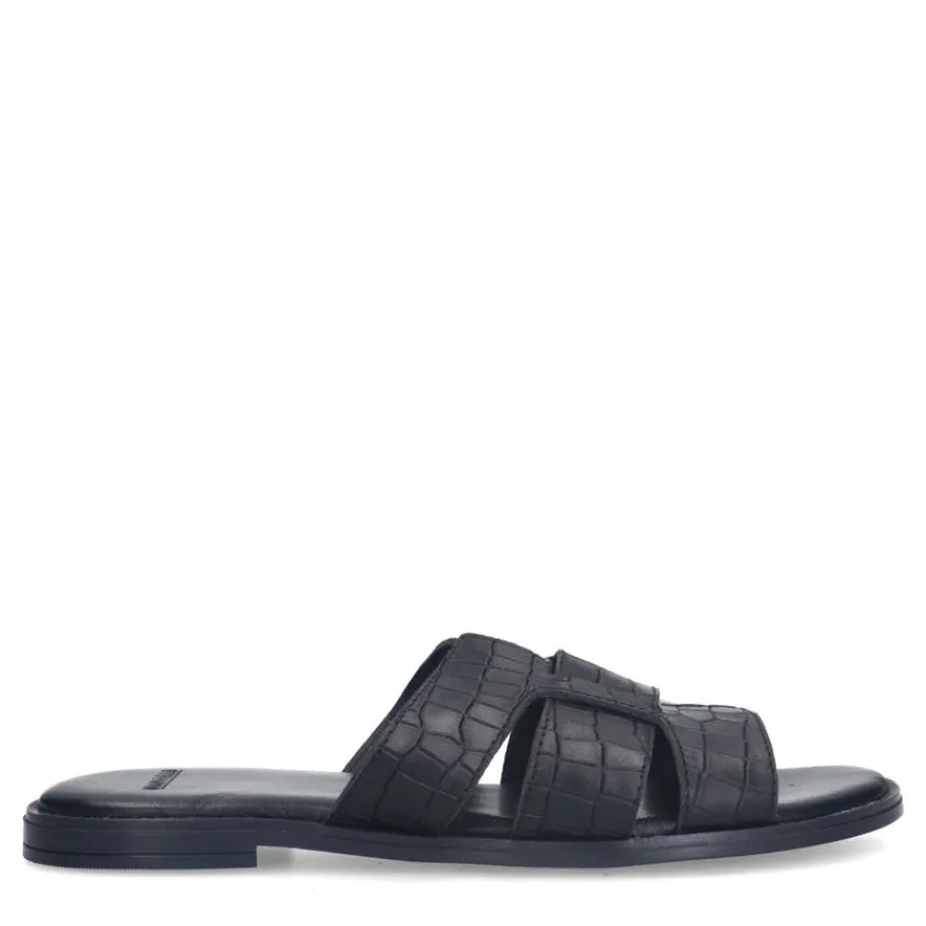Zwarte leren croco slippers van Manfield, met platte hak van 1 cm en brede band op de voorvoet. We adviseren als verzorging en bescherming de Collonil Carbon Pro.