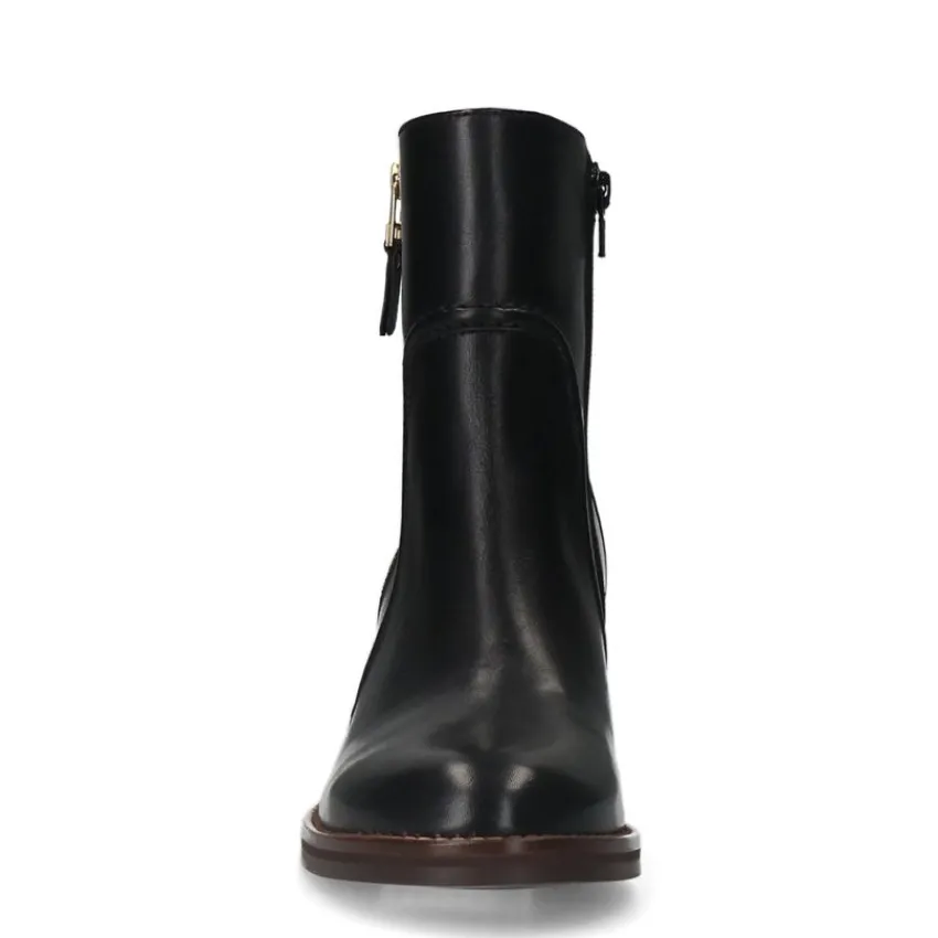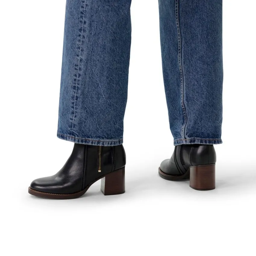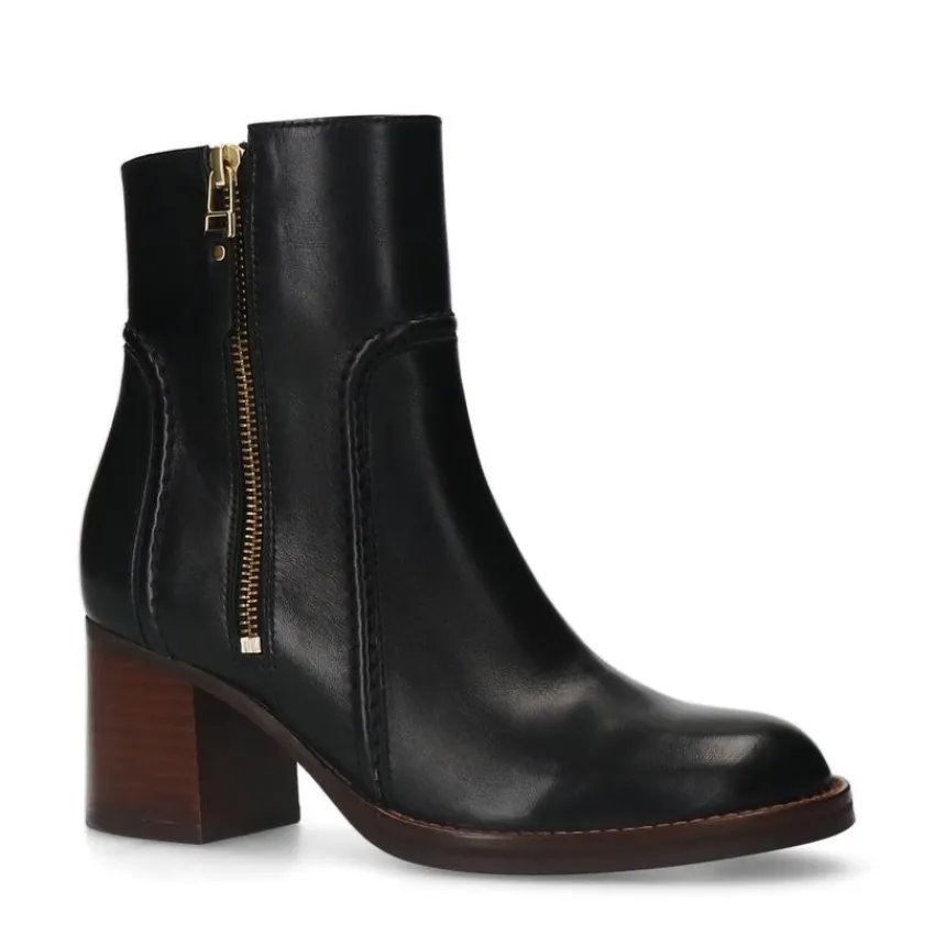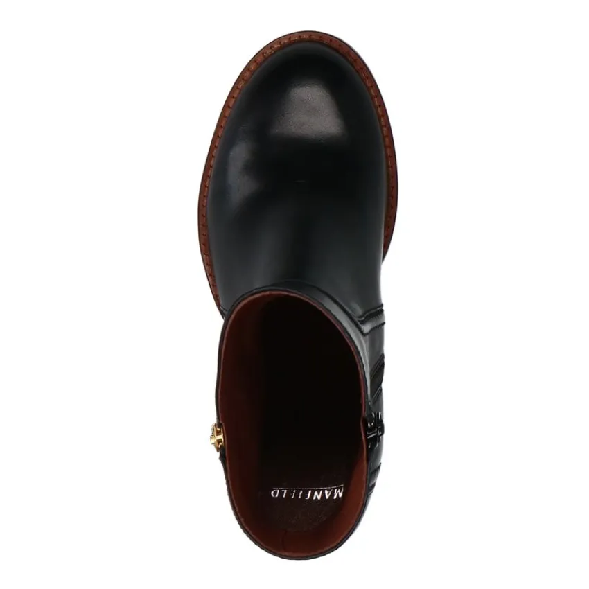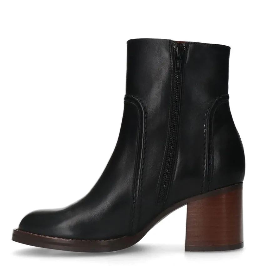 Zwarte leren enkellaarsjes met hak van Manfield met een nep rits aan de buitenzijde. De laarsjes hebben een ritssluiting aan de binnenzijde en een bruine blokhak van 6 cm. We adviseren als verzorging en bescherming de Collonil Carbon Pro.