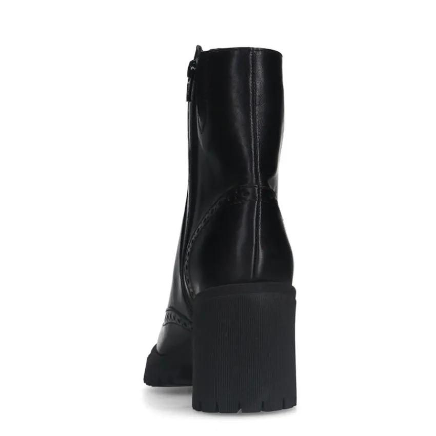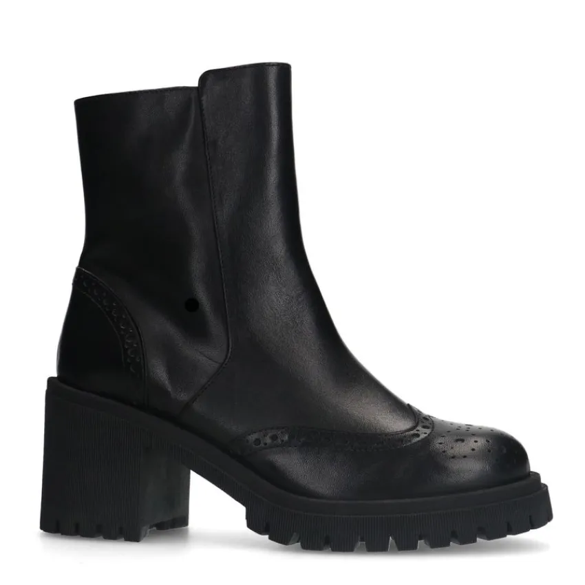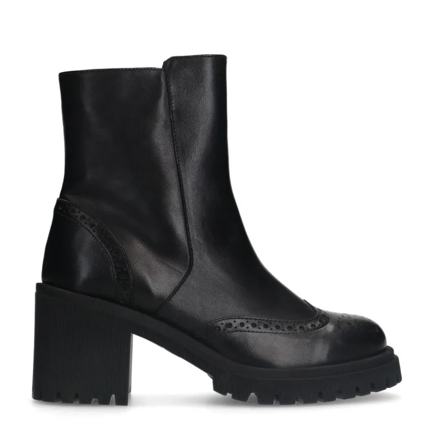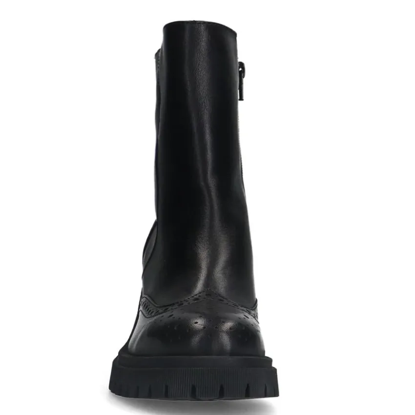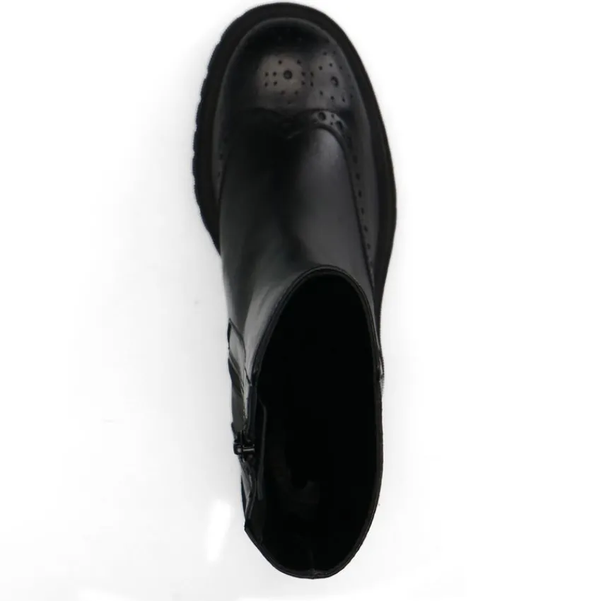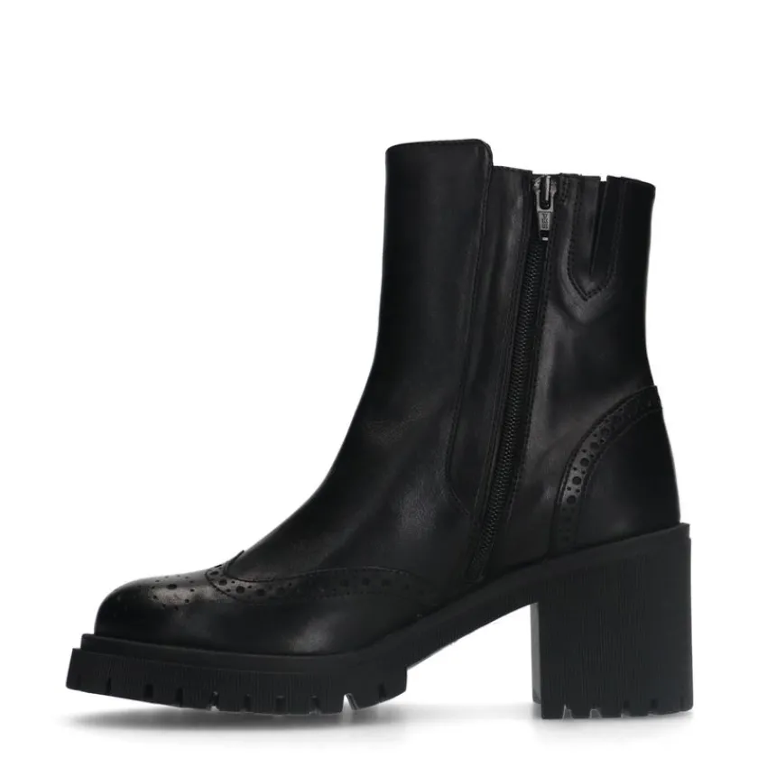 Zwarte leren enkellaarsjes van Manfield met blokhak van 8 cm, plateauzool van 2 cm en ritssluiting aan de binnenzijde. We adviseren als verzorging en bescherming de Collonil Carbon Pro.