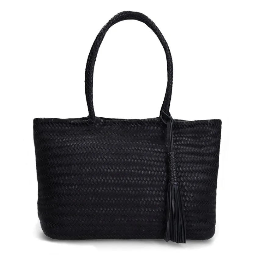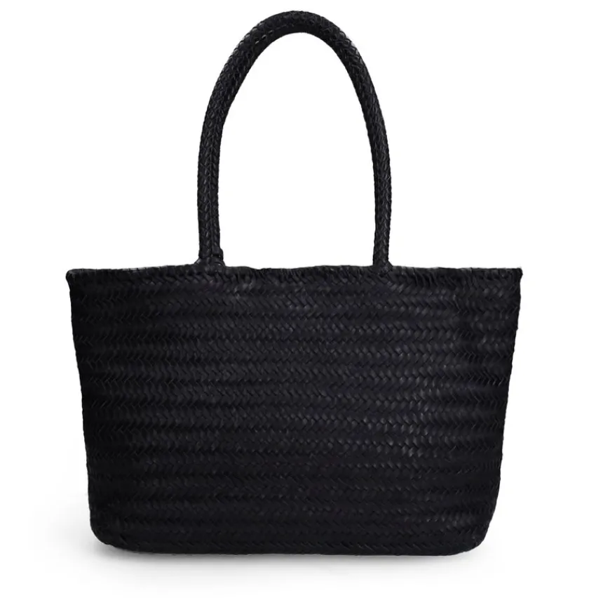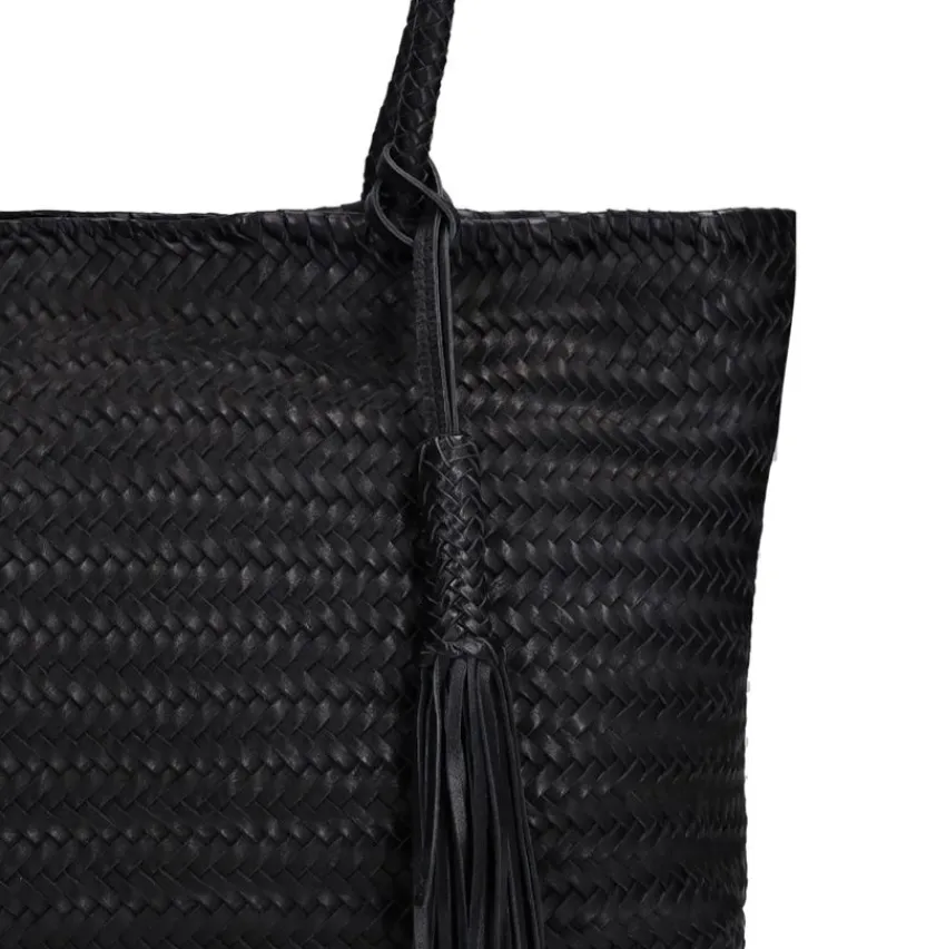 Zwarte leren gevlochten handtas van Manfield met ritssluiting, dubbelzijdig vak aan de binnenzijde, ritsvak en gevlochten detail aan de tas hangen. De afmeting van de tas is 43x27x15 cm, (BxHxD).